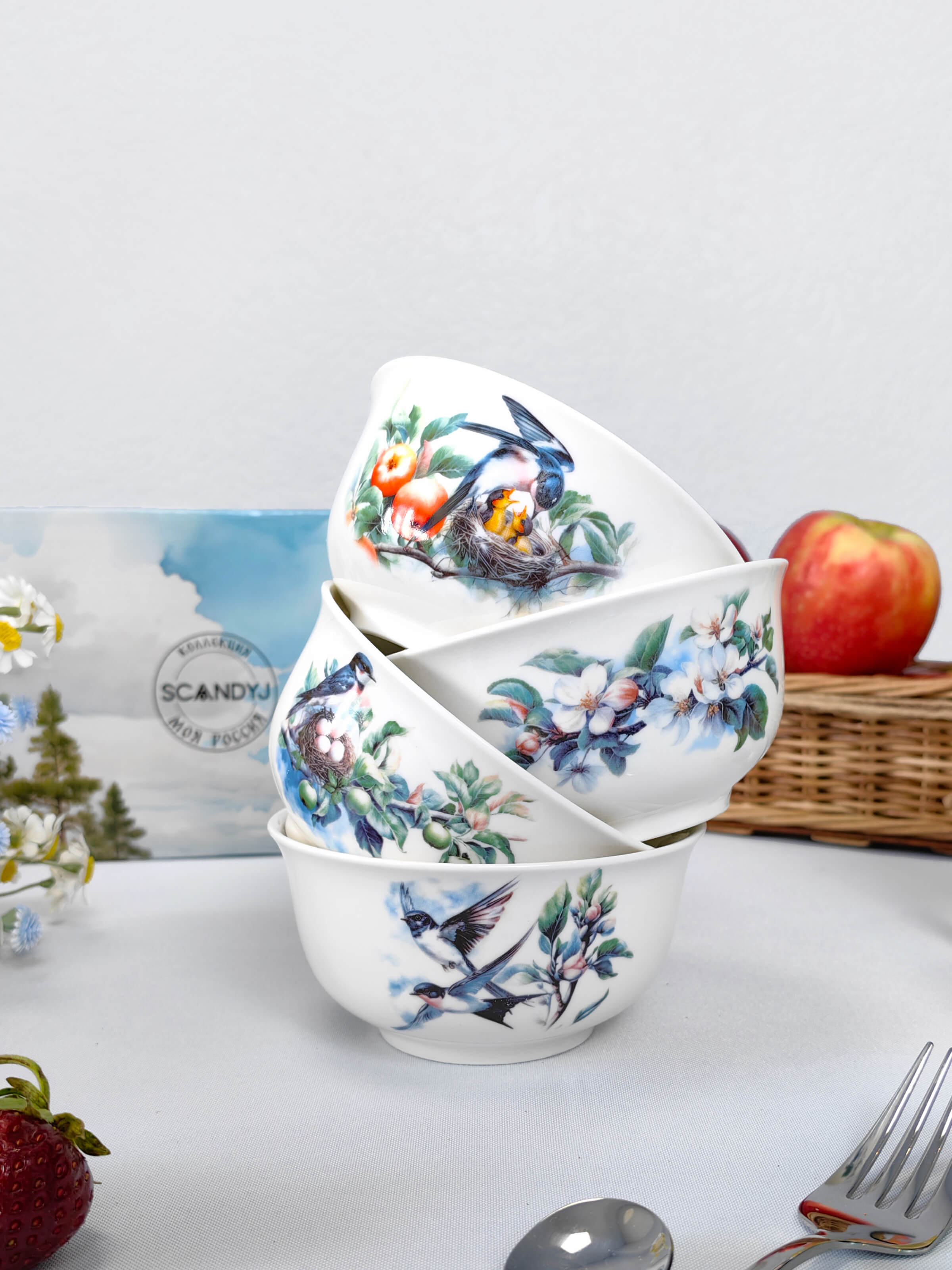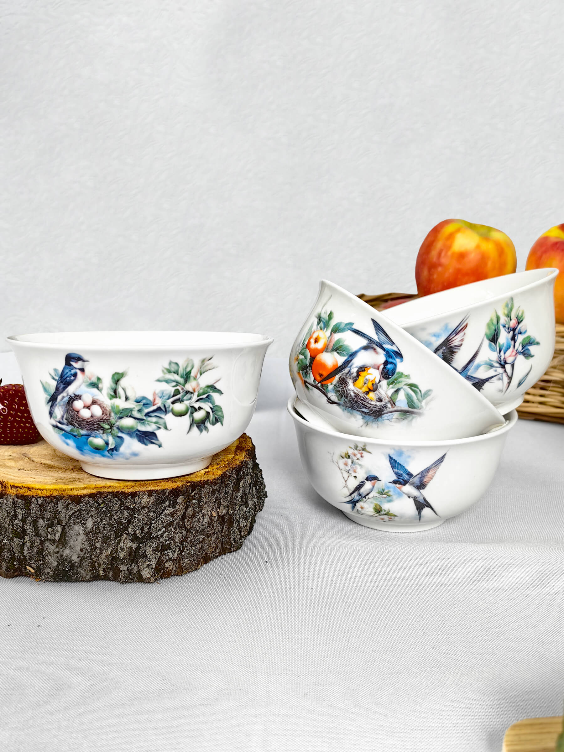 Набор пиал для сервировки (4 шт.) — коллекция «История любви ласточек» В каждой пиале — лето, сплетённое из крыльев и нежности. Четыре этапа любви, застывшие в керамике: — Первый танец над цветущей веткой — Свадебный полёт сквозь яблоневый цвет — Терпение ожидания в уютном гнезде — Щедрость родительства под сенью алых яблок