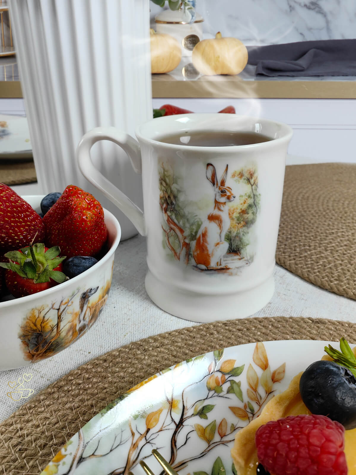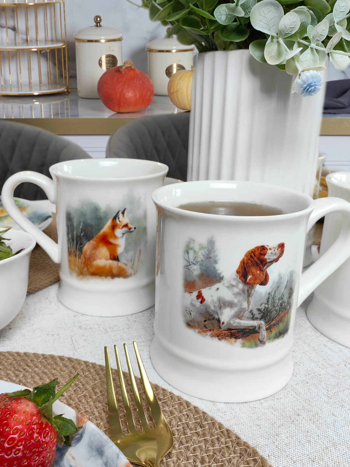 Набор выполнен из прочного фарфора — утонченного, тактильно приятного, с благородным блеском, украшен изысканными золотыми акцентами царской эпохи. Объем кружки — 320мл: идеален для согревающего чая из самовара, ароматного сбитня, бодрящего утреннего кофе или вечерней медовухи после долгой скачки. Удобная ручка уверенно ложится в ладонь, напоминая о надежности охотничьей амуниции.
