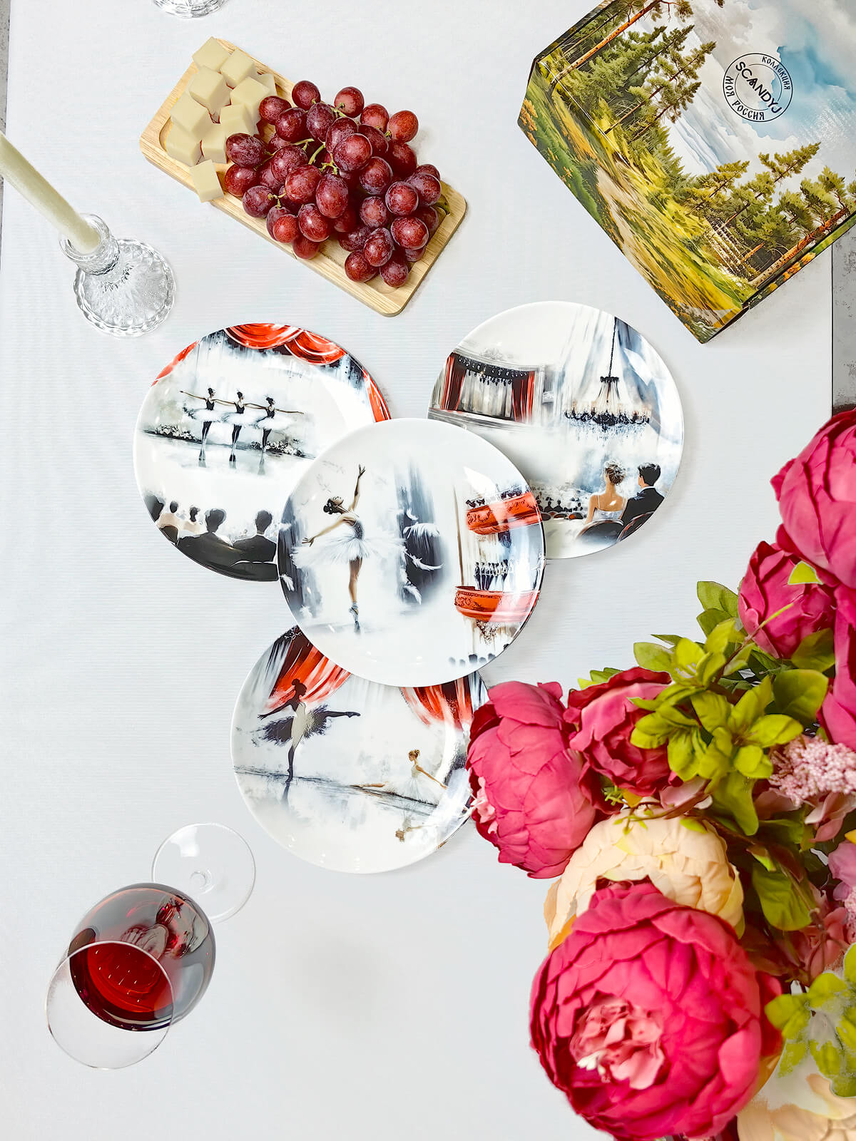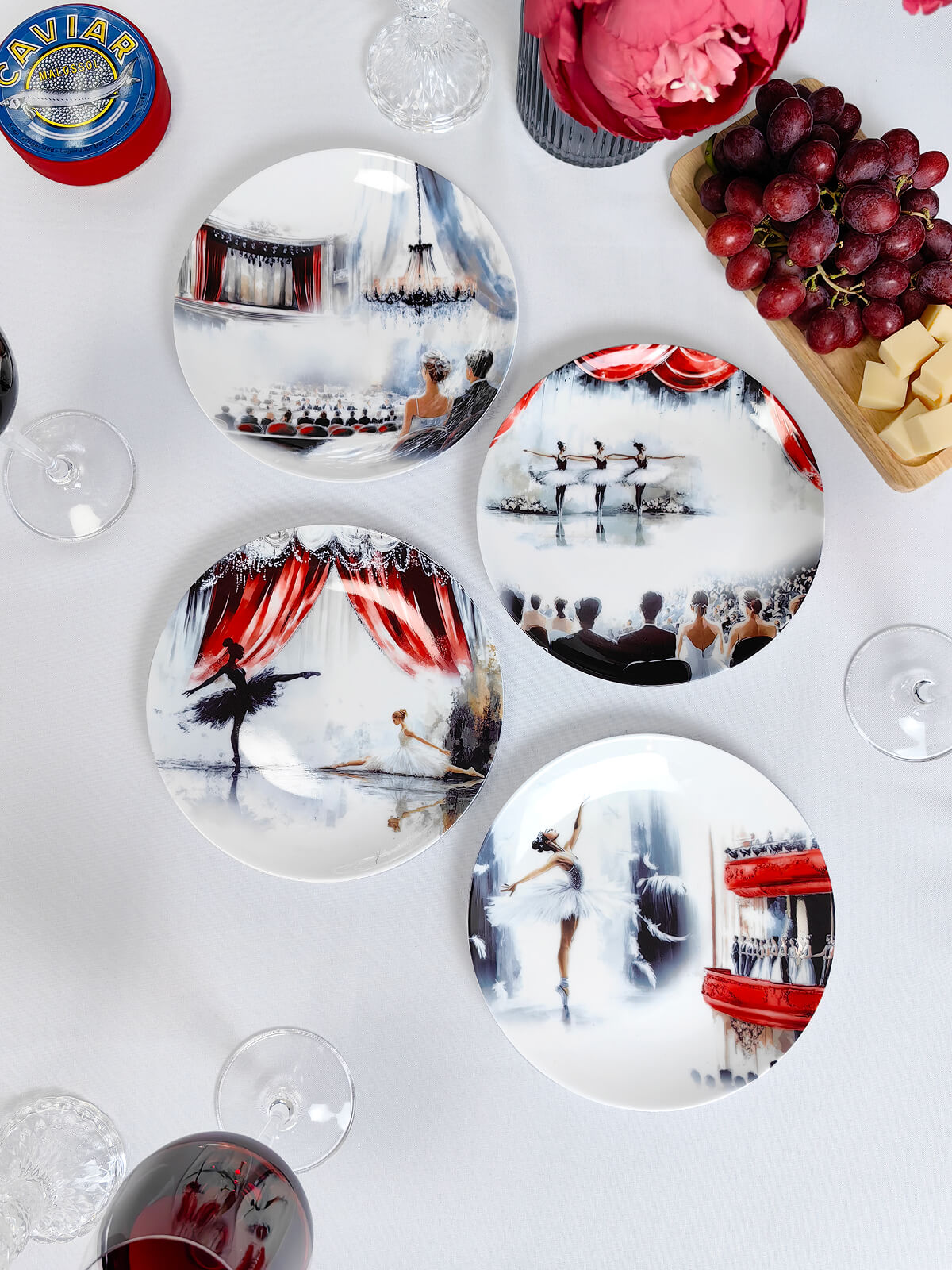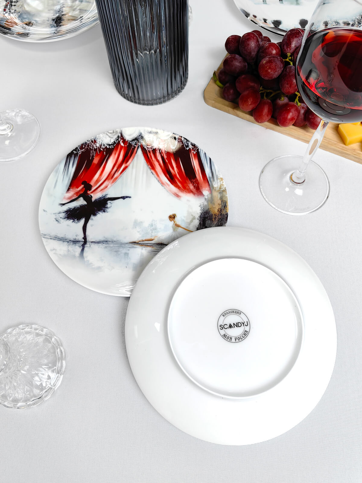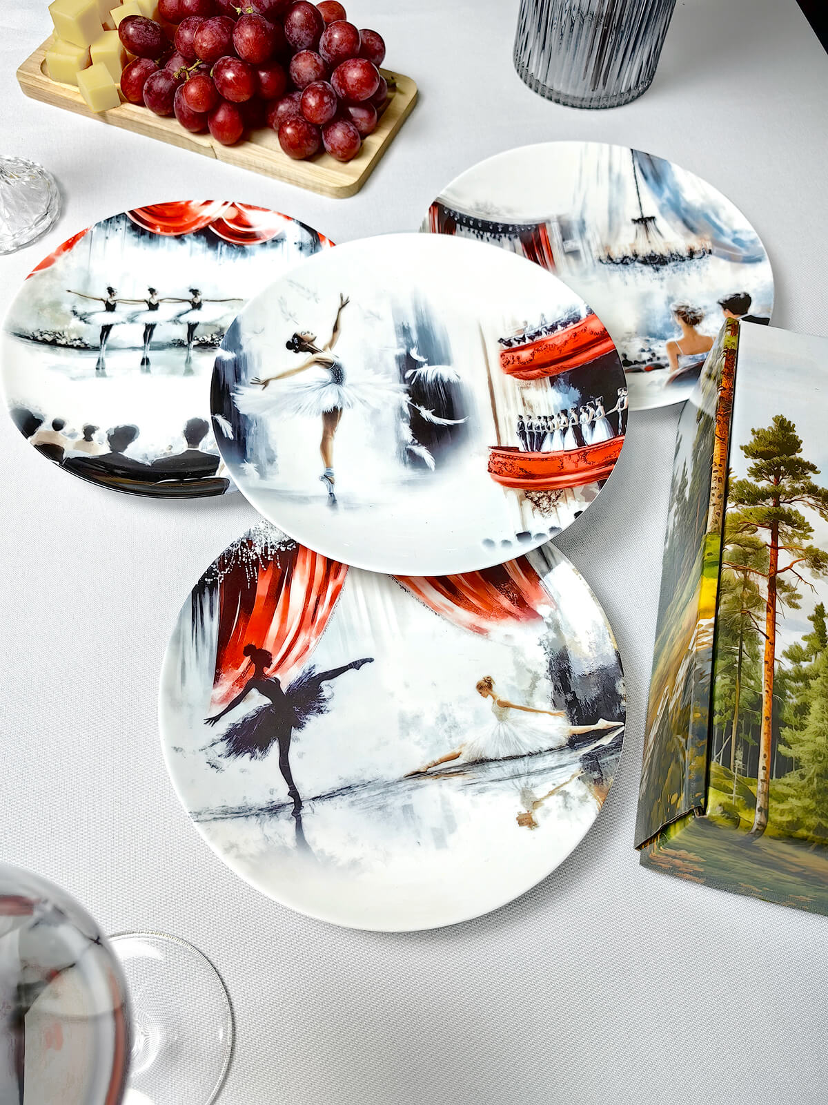 Почувствуйте магию сцены и изящество великого искусства — в каждой тарелке этой коллекции живёт момент из спектакля. Четыре иллюстрации переносят вас в атмосферу вечернего театра: где замирает зрительный зал, взлетают пачки балерин, сверкают люстры и кружатся белые перья — словно па-де-де застыло в фарфоре.