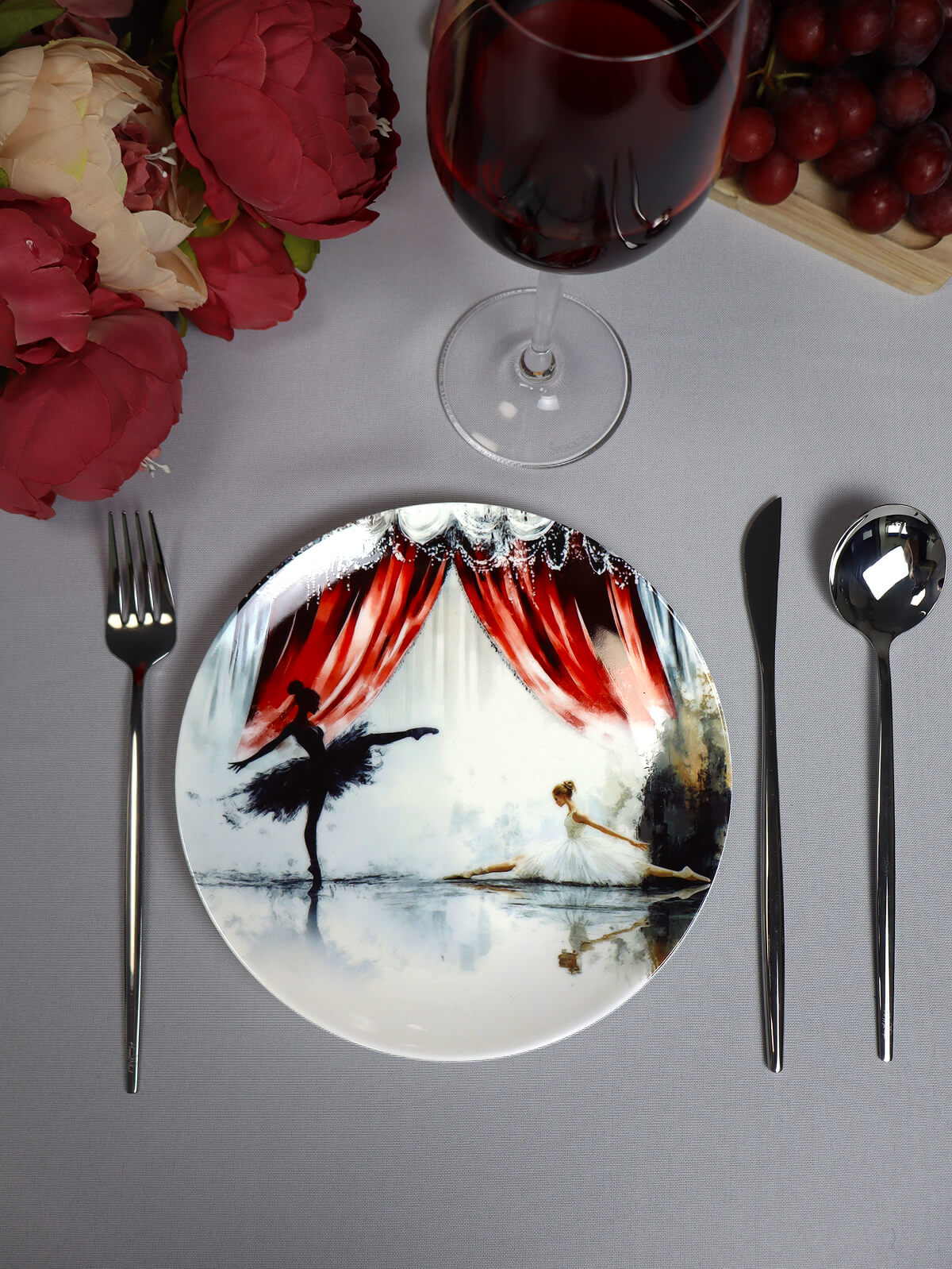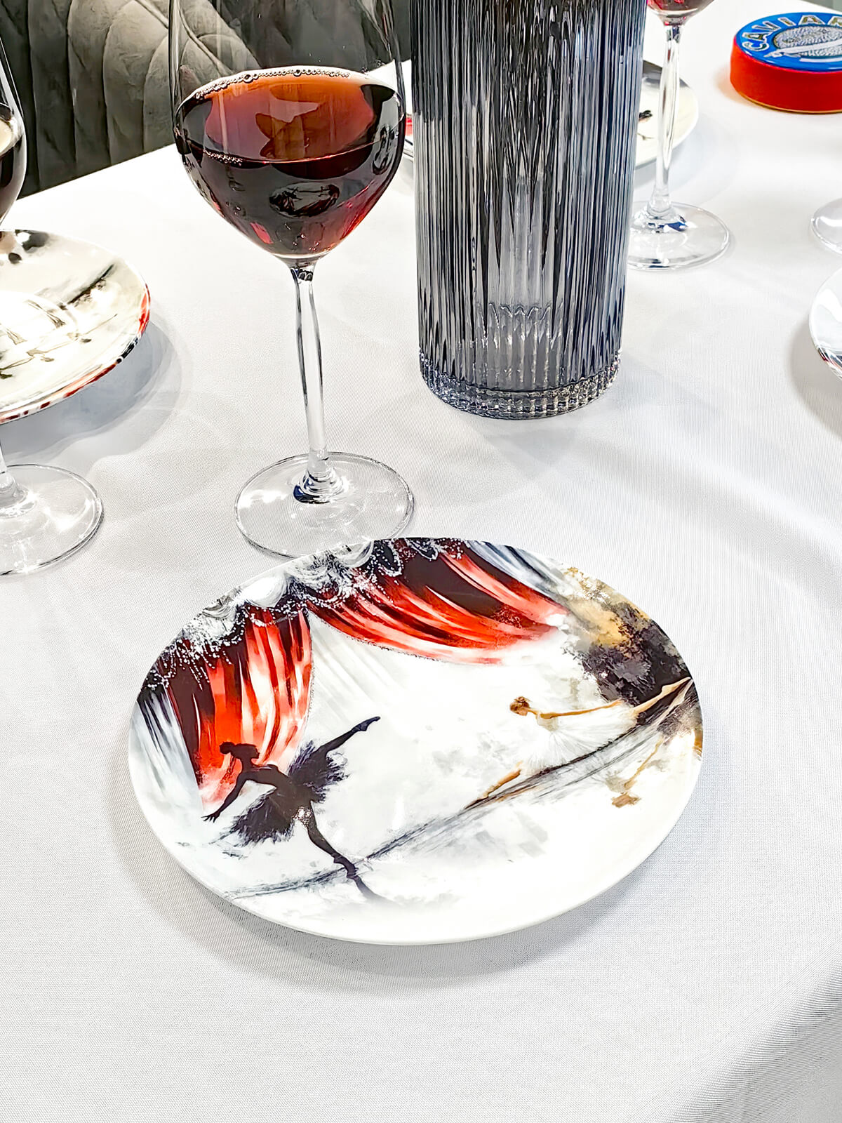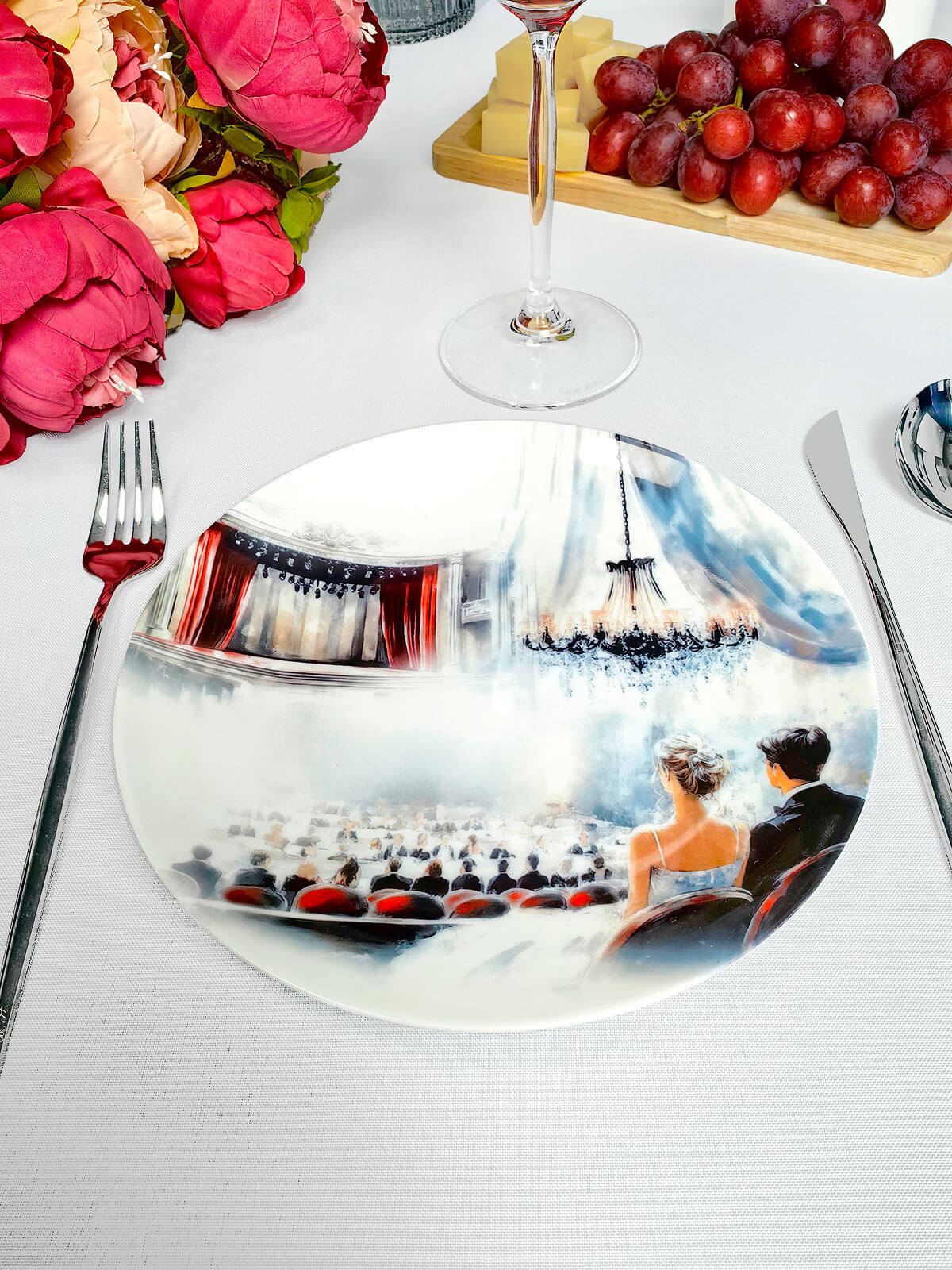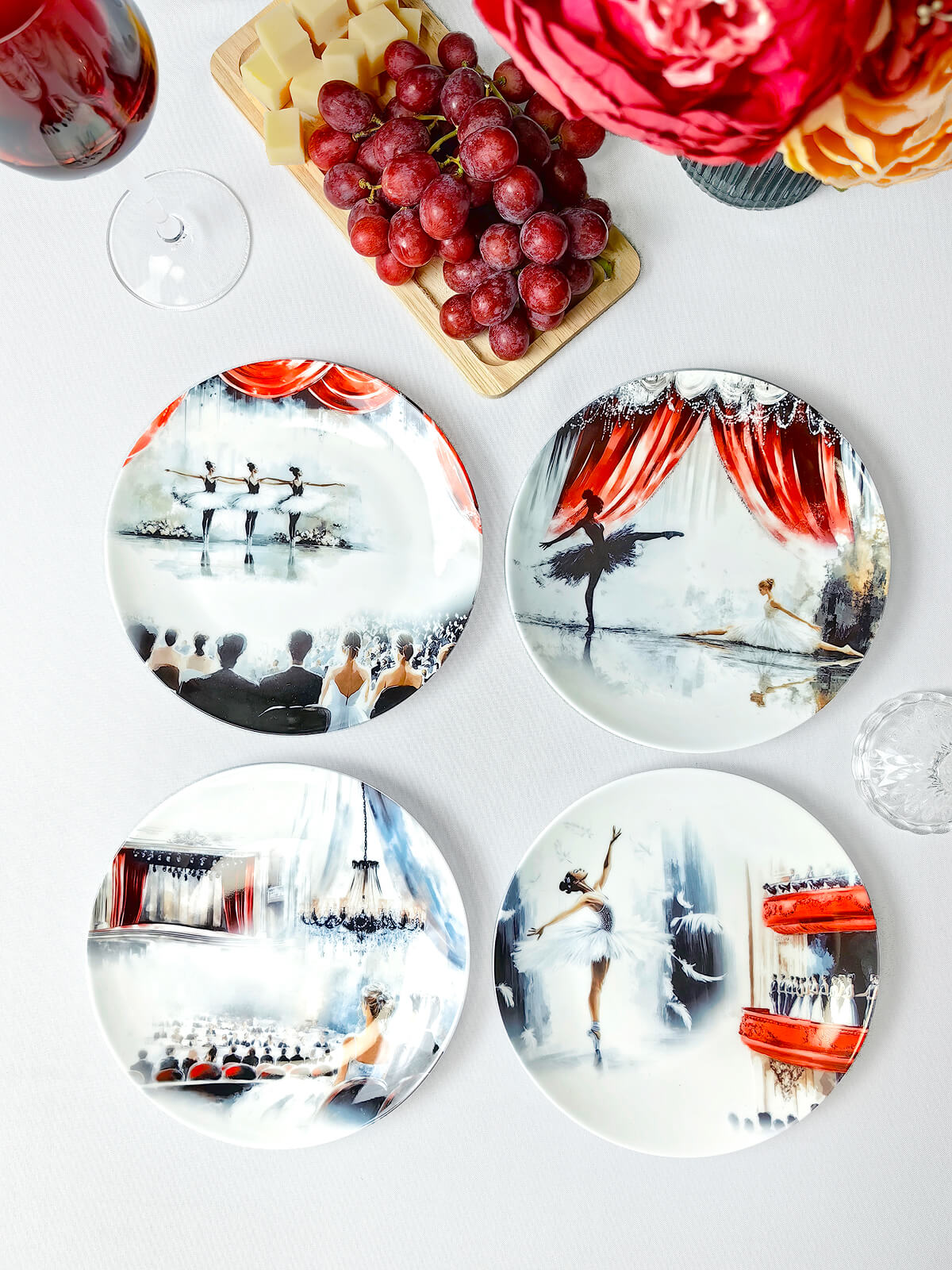 Почувствуйте магию сцены и изящество великого искусства — в каждой тарелке этой коллекции живёт момент из спектакля. Четыре иллюстрации переносят вас в атмосферу вечернего театра: где замирает зрительный зал, взлетают пачки балерин, сверкают люстры и кружатся белые перья — словно па-де-де застыло в фарфоре.