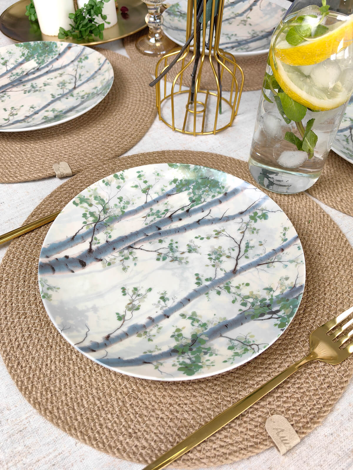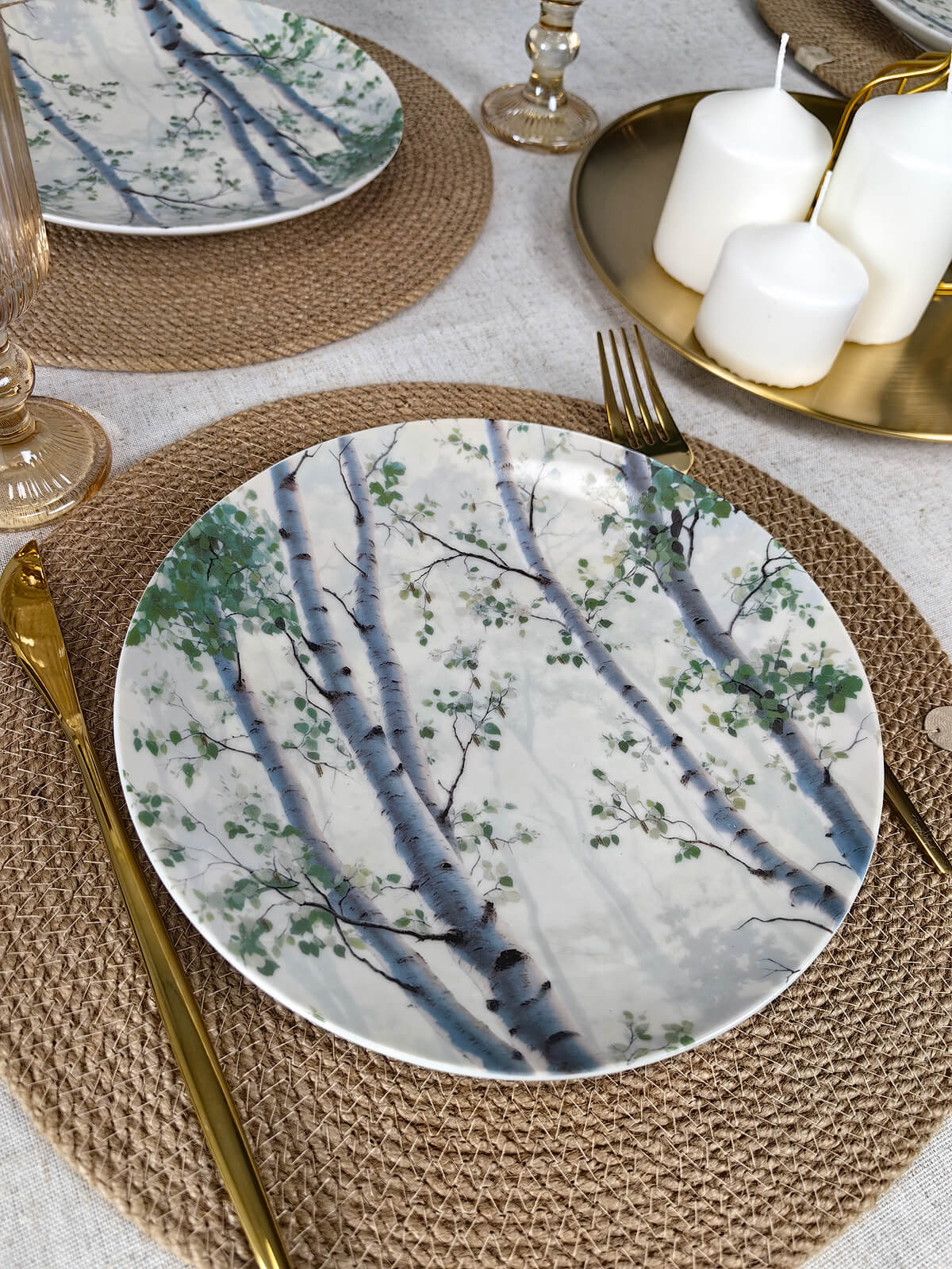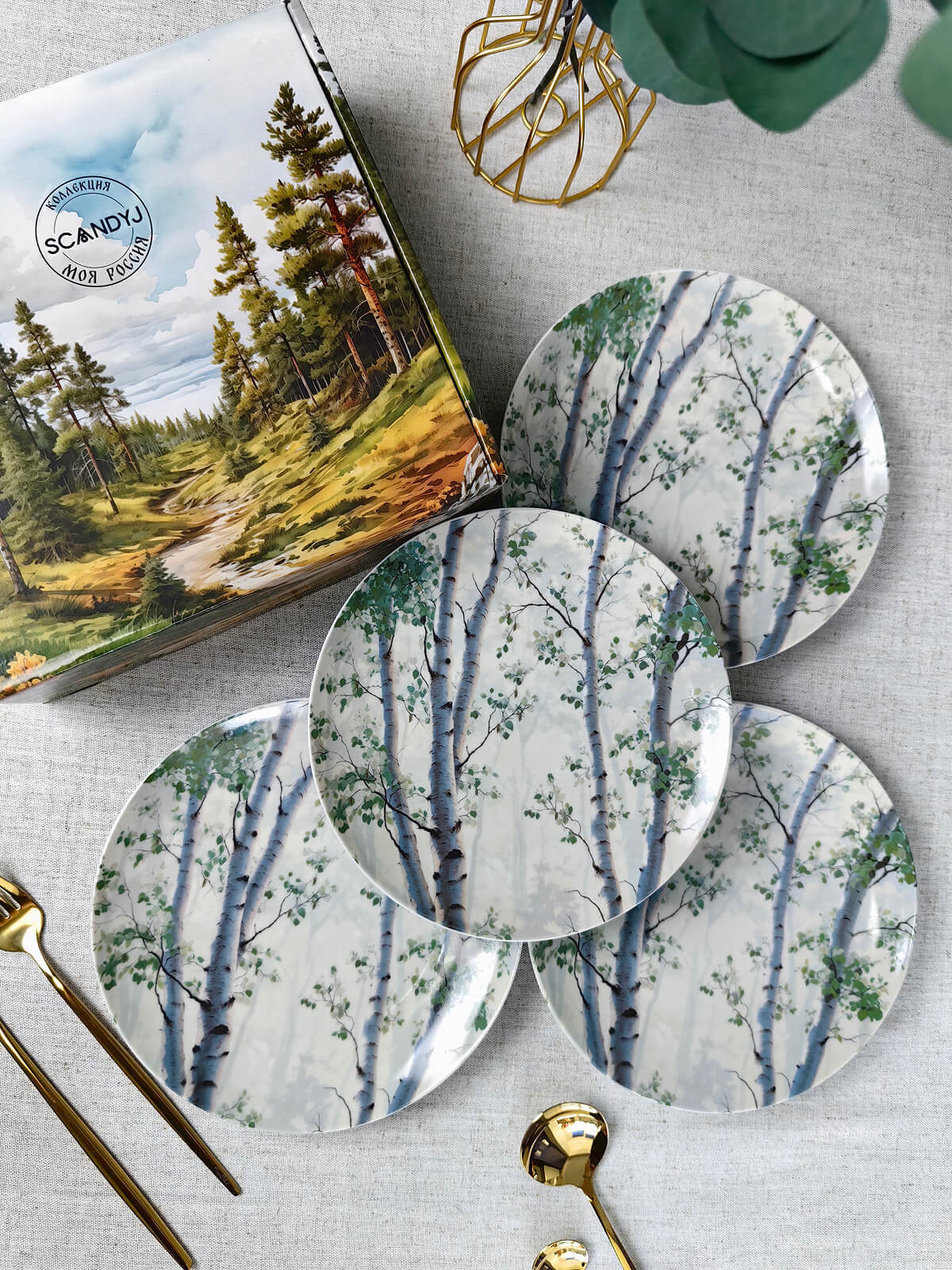 Набор тарелок 20,5 см (4 шт.) — коллекция «Русские березы» Поэзия белоствольной красы в каждой детали: Идентичные рисунки тонких берез с кружевом крон на матовом фарфоре. Бархатные стволы, резные листья, позолота росы — будто утренний свет в роще.