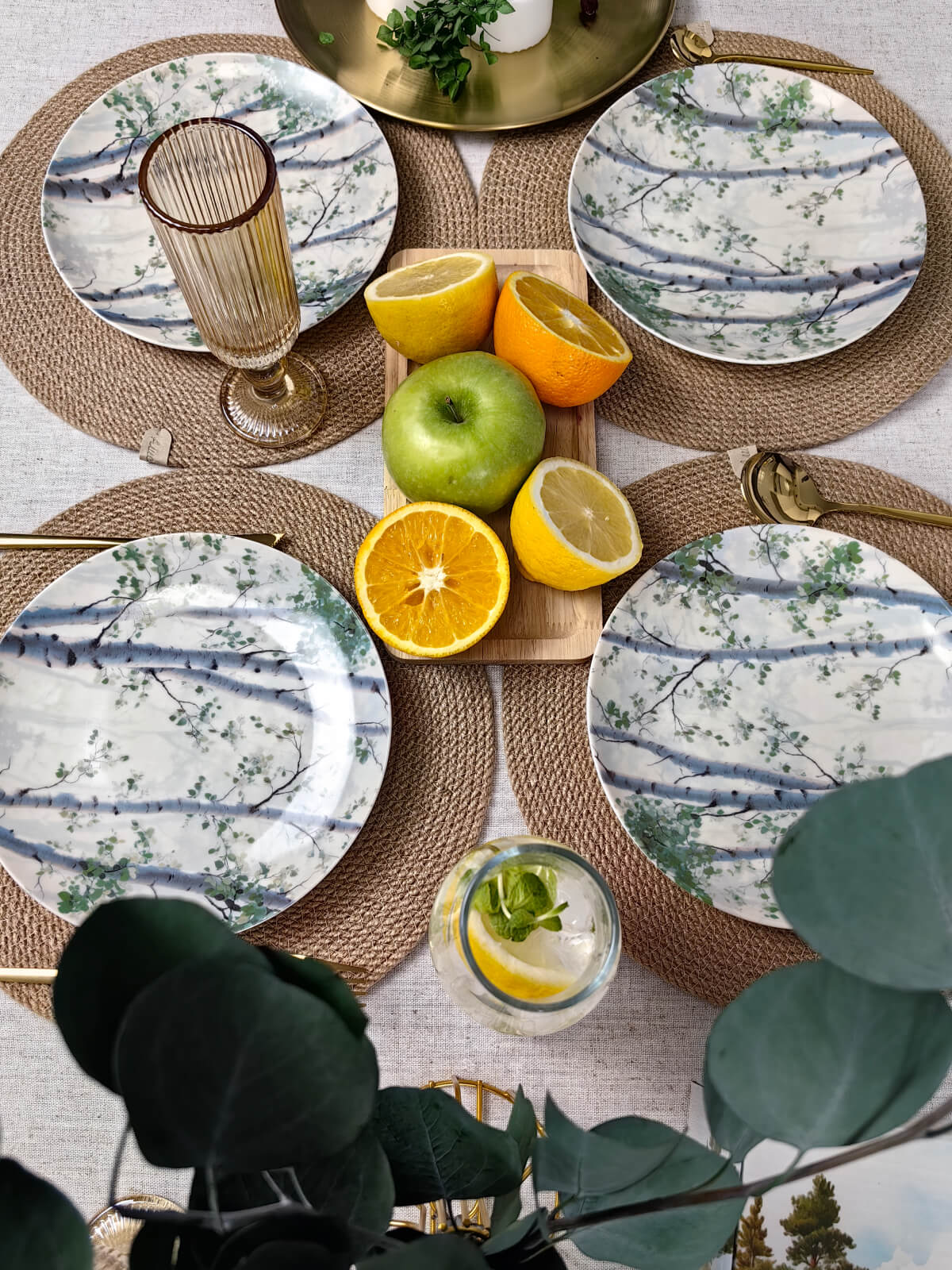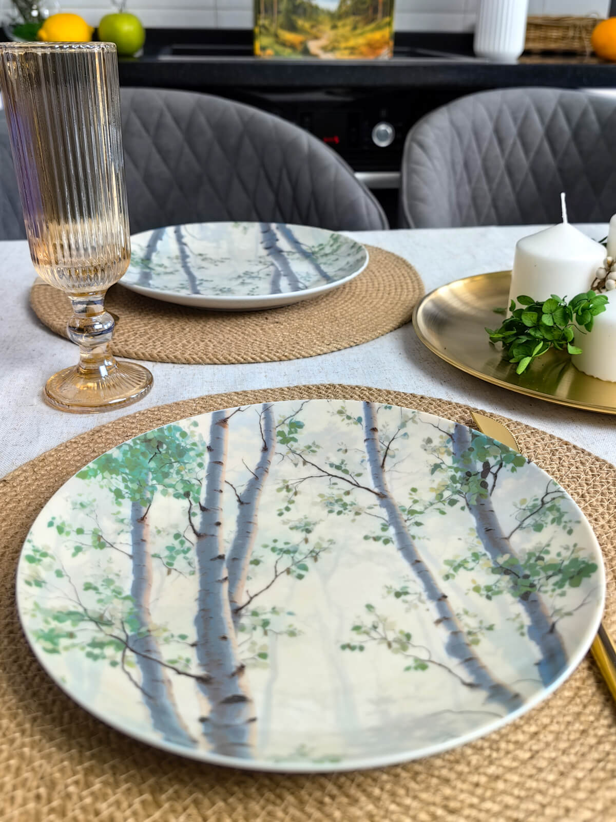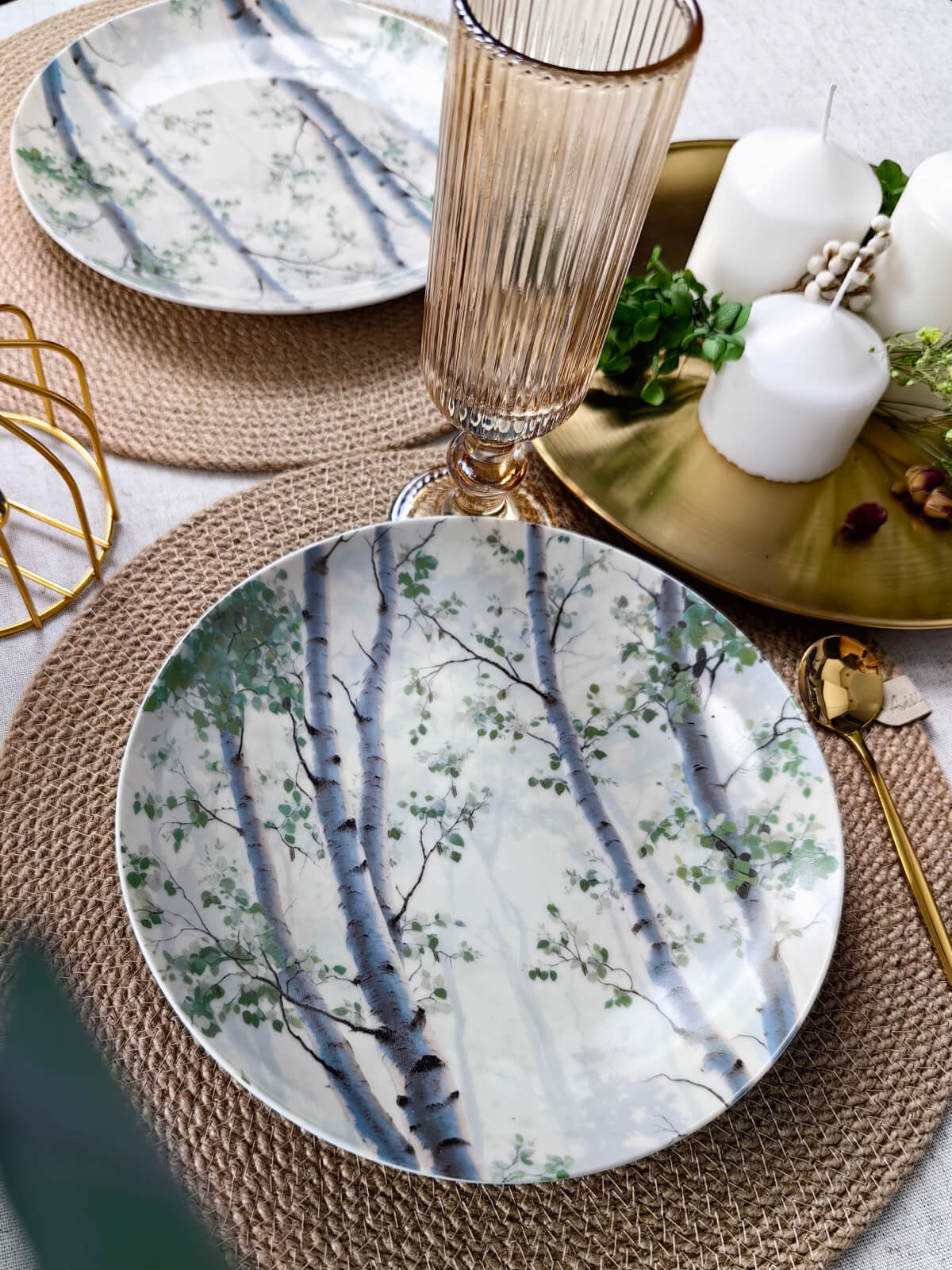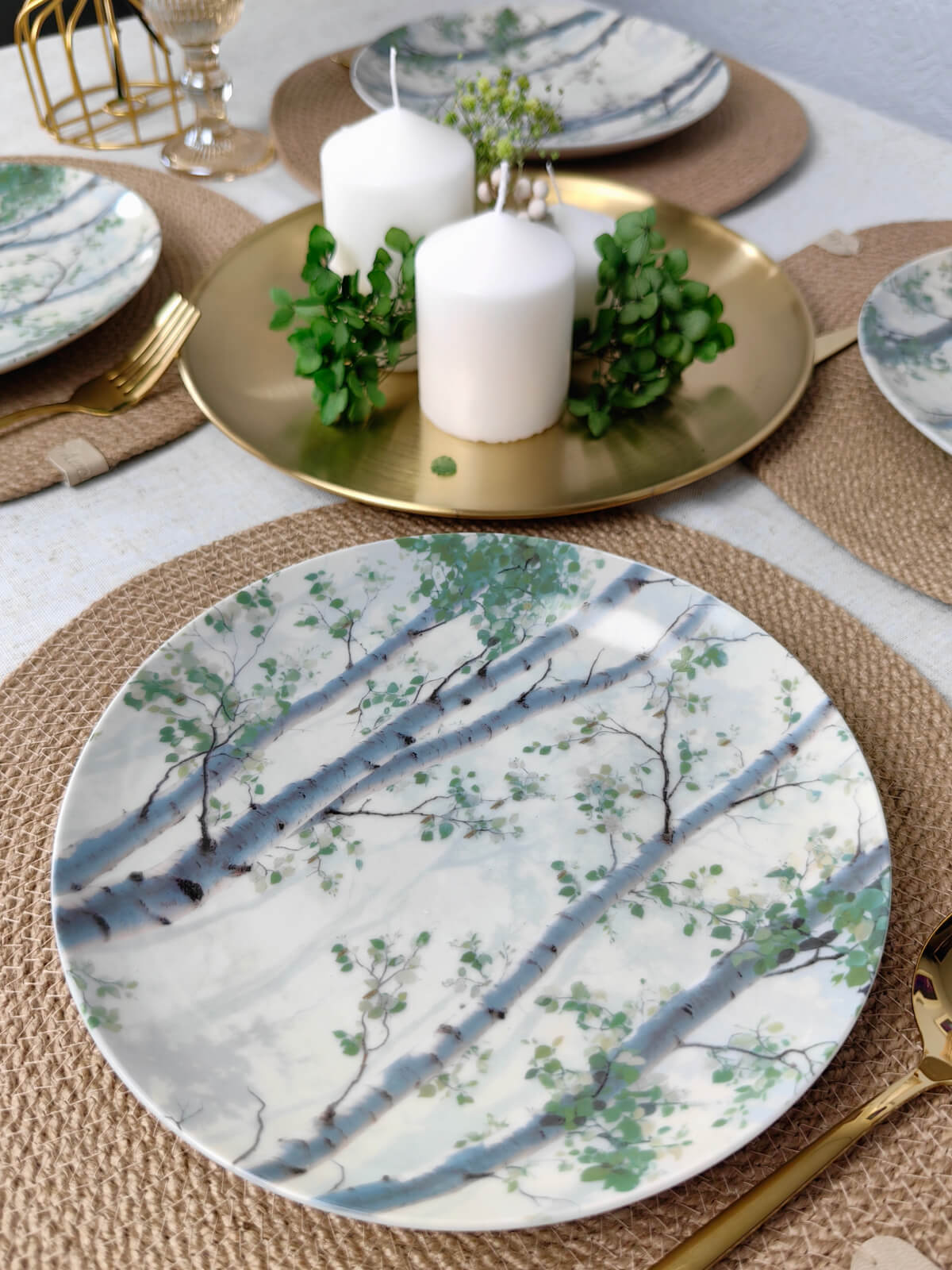 Набор тарелок 20,5 см (4 шт.) — коллекция «Русские березы» Поэзия белоствольной красы в каждой детали: Идентичные рисунки тонких берез с кружевом крон на матовом фарфоре. Бархатные стволы, резные листья, позолота росы — будто утренний свет в роще.