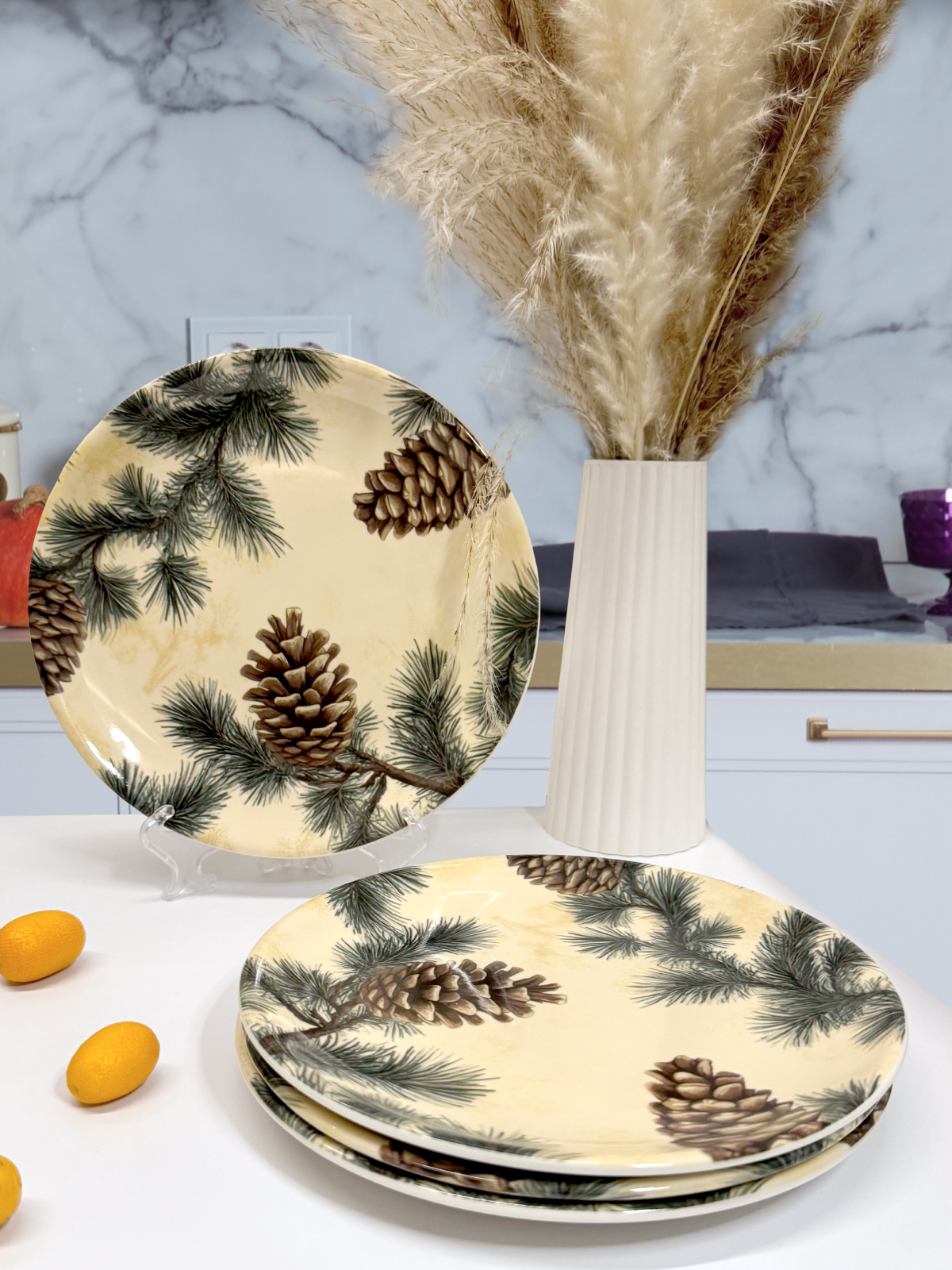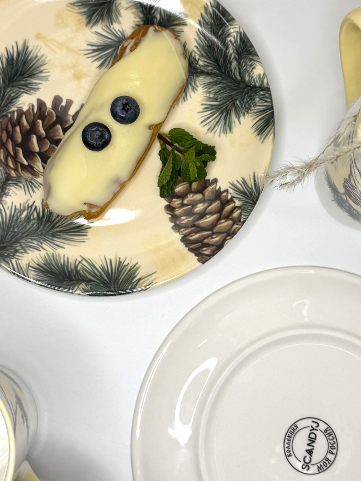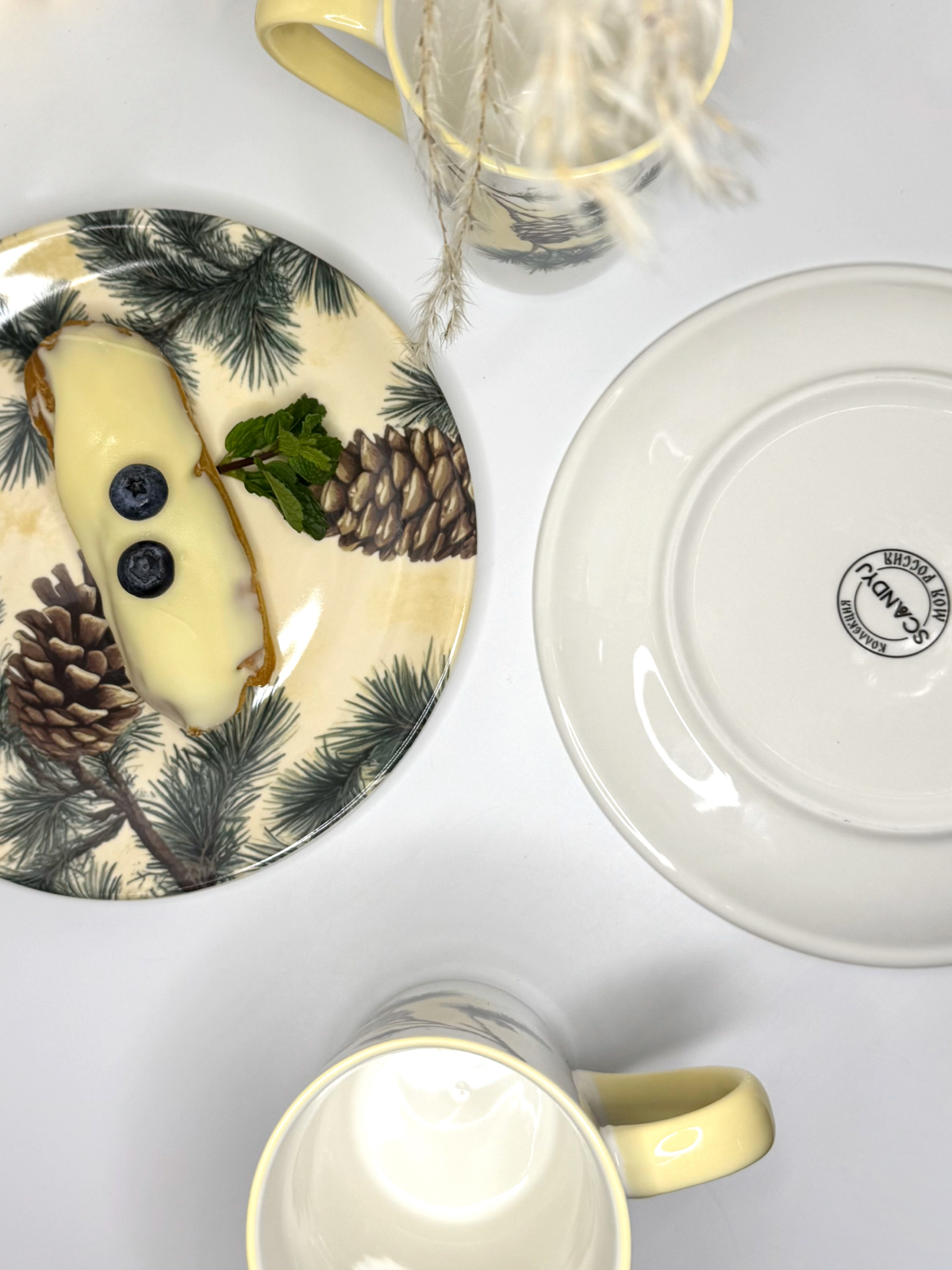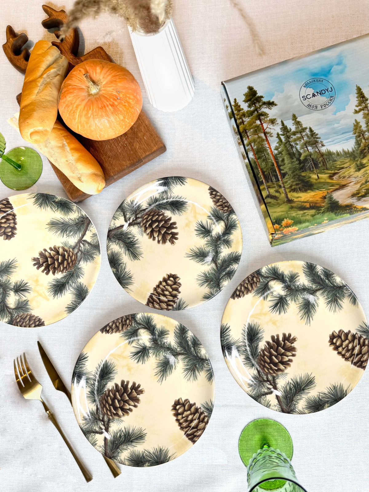 Тарелки из благородного фарфора (диаметр 20,5 см) с лёгким матовым сиянием. Детали ручной проработки: — глубина изумрудной хвои, — позолота на чешуйках шишек, — акварельные переливы фона, будто солнечные блики на лесной поляне.