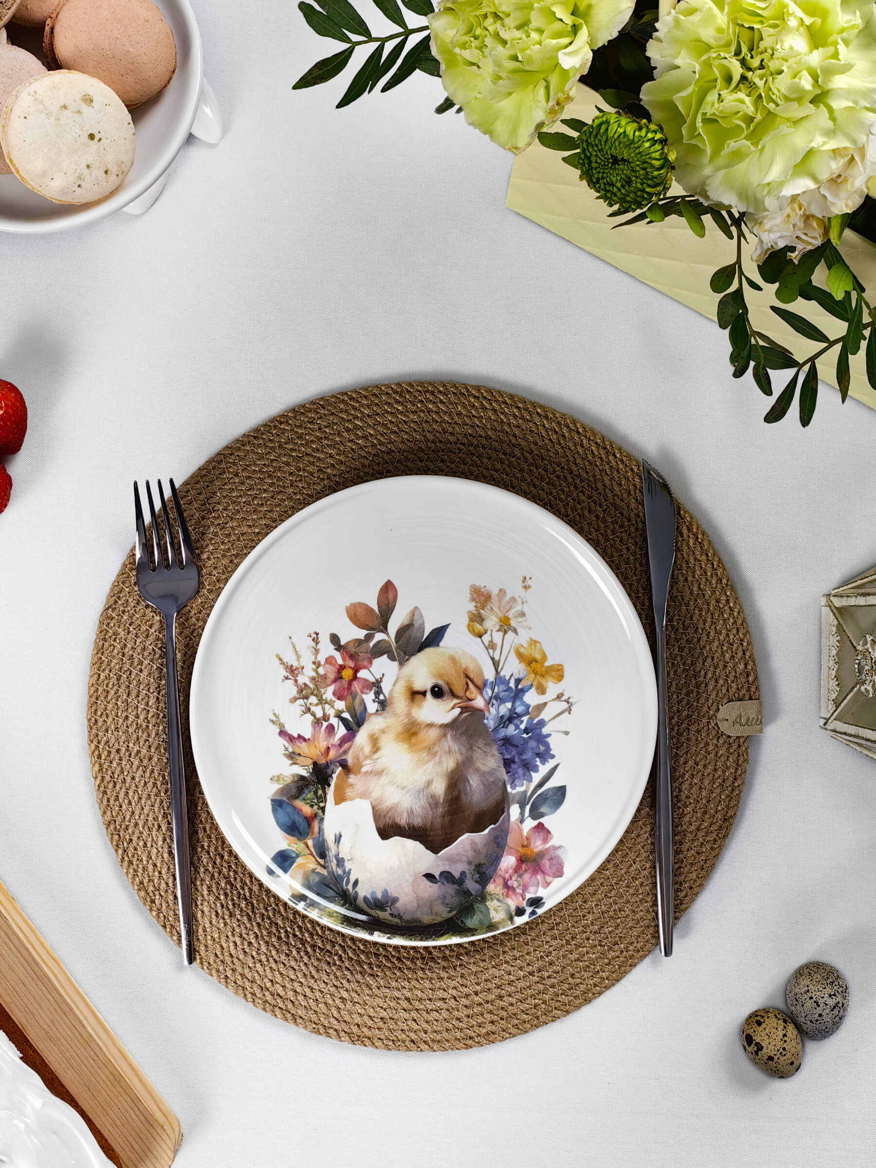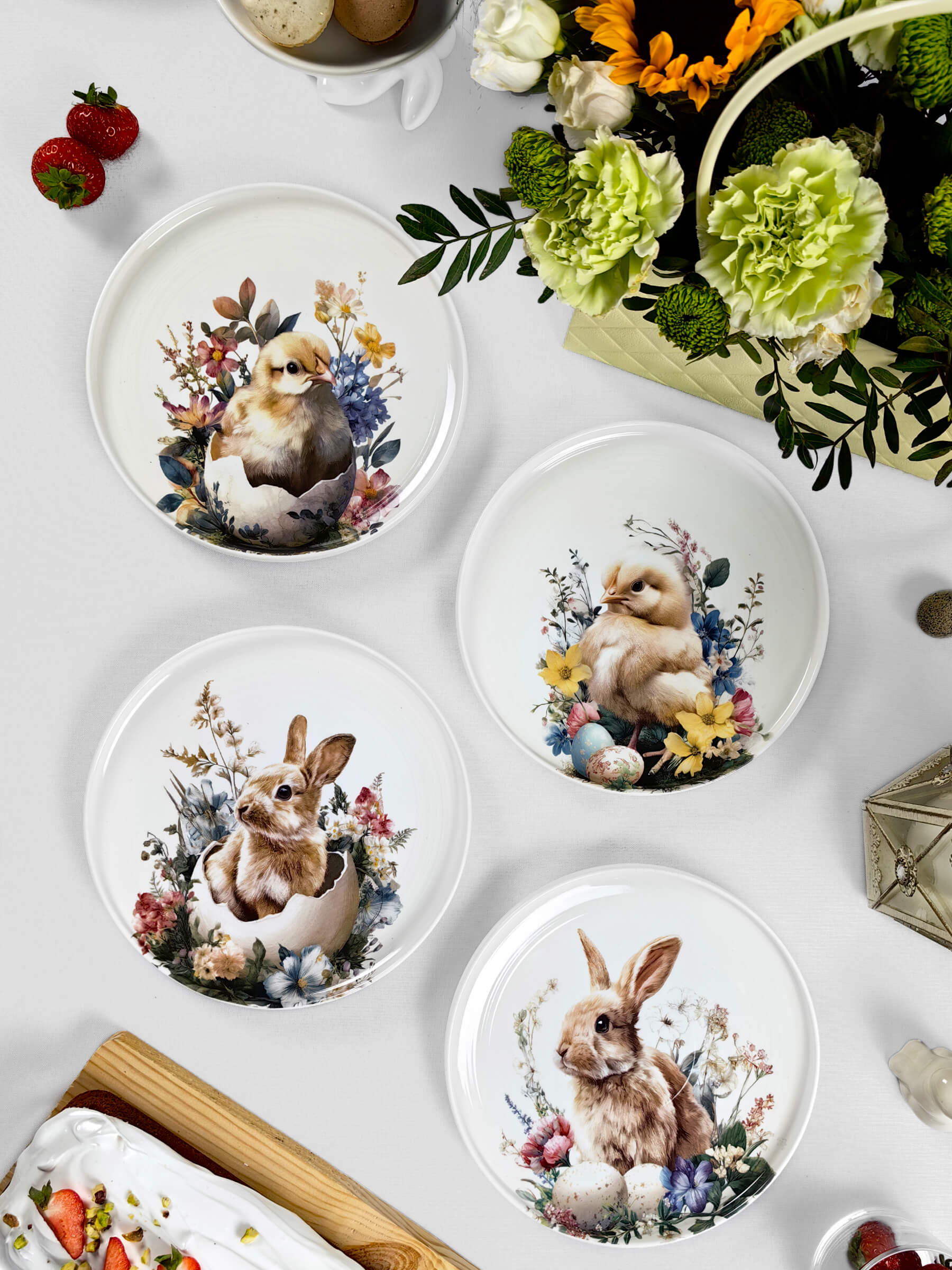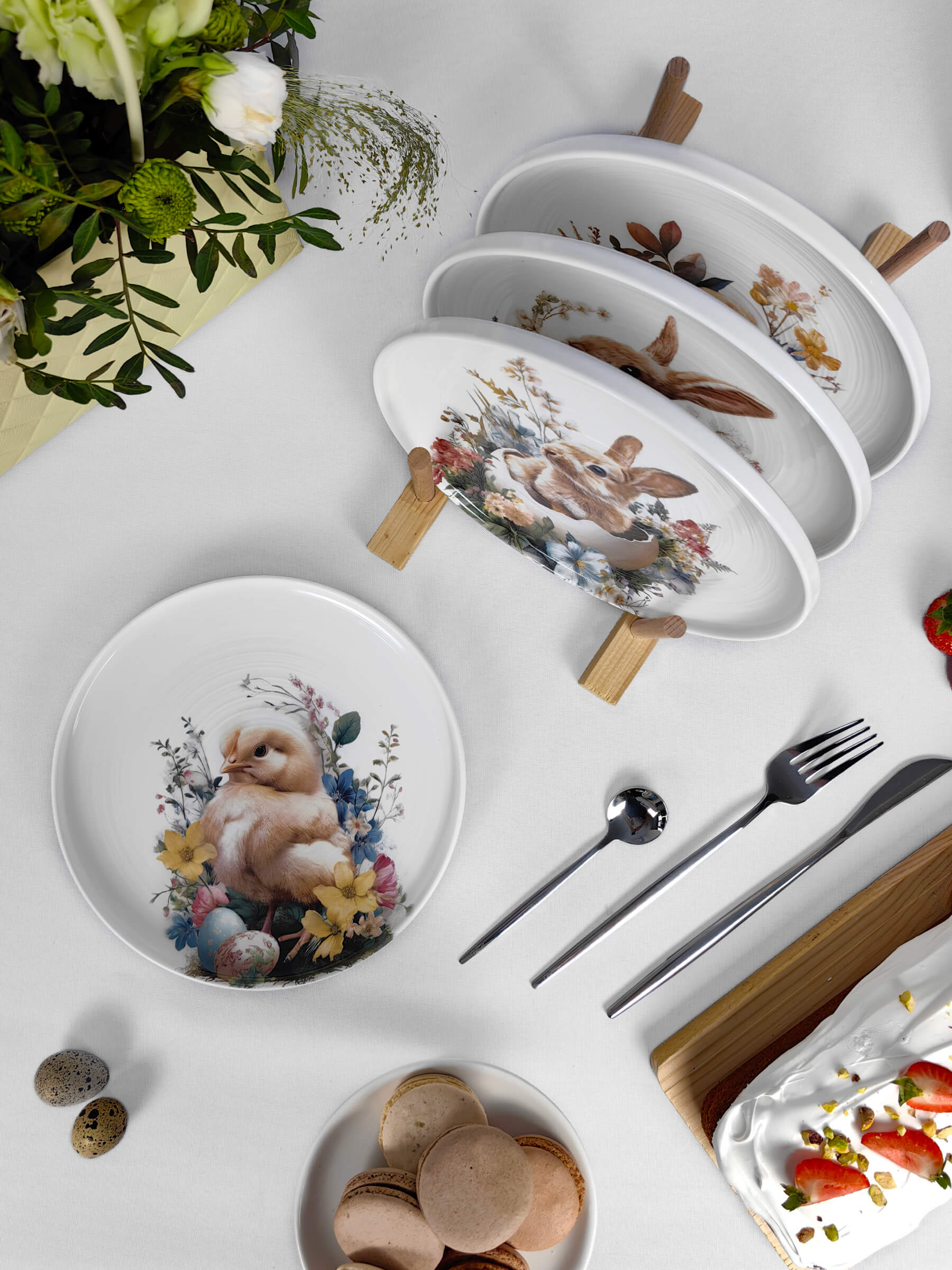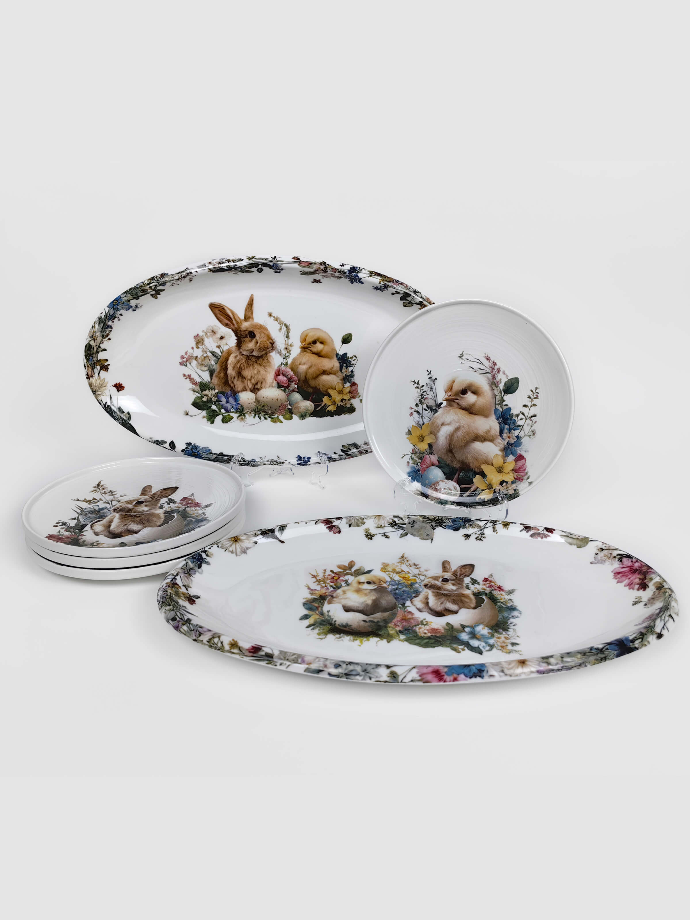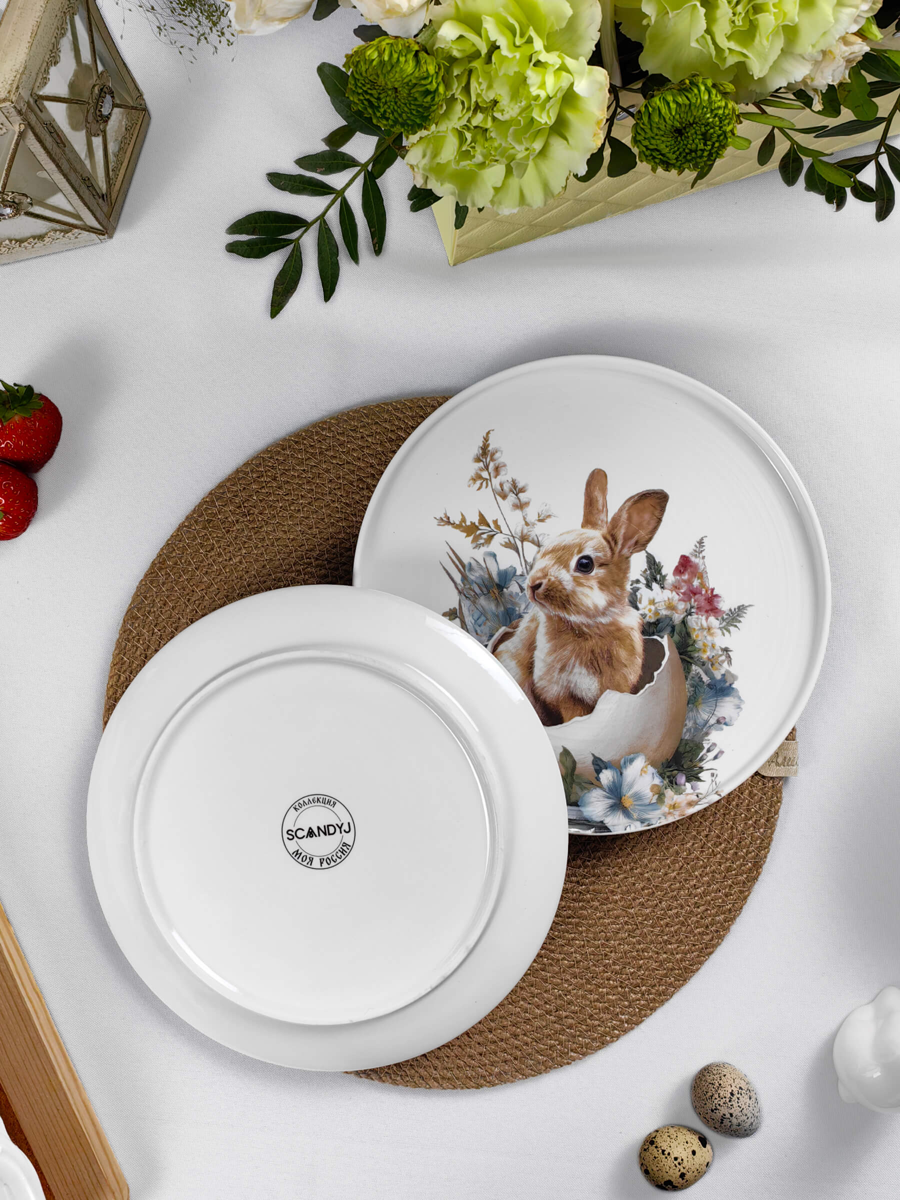 Белый фарфор с тёплым матовым блеском становится холстом для этой светлой истории. Глубокий бортик тарелок обрамляет сюжет, как оконная рама — вид на самый радостный день весны. Авторские рисунки созданы с любовью к деталям: каждый пушок на цыплёнке, каждый усик крольчонка, каждый лепесток и капелька росы на крашеном яйце.