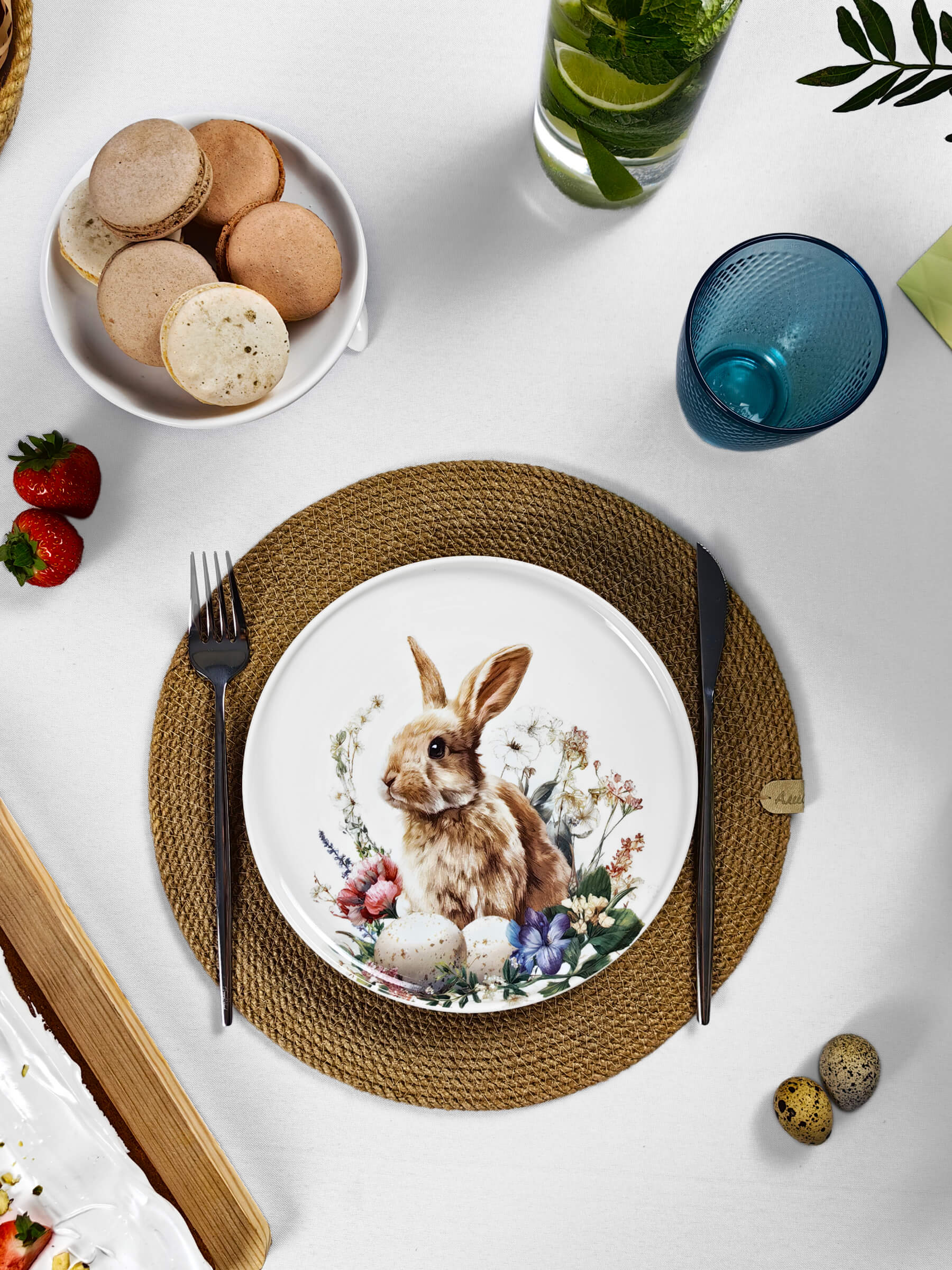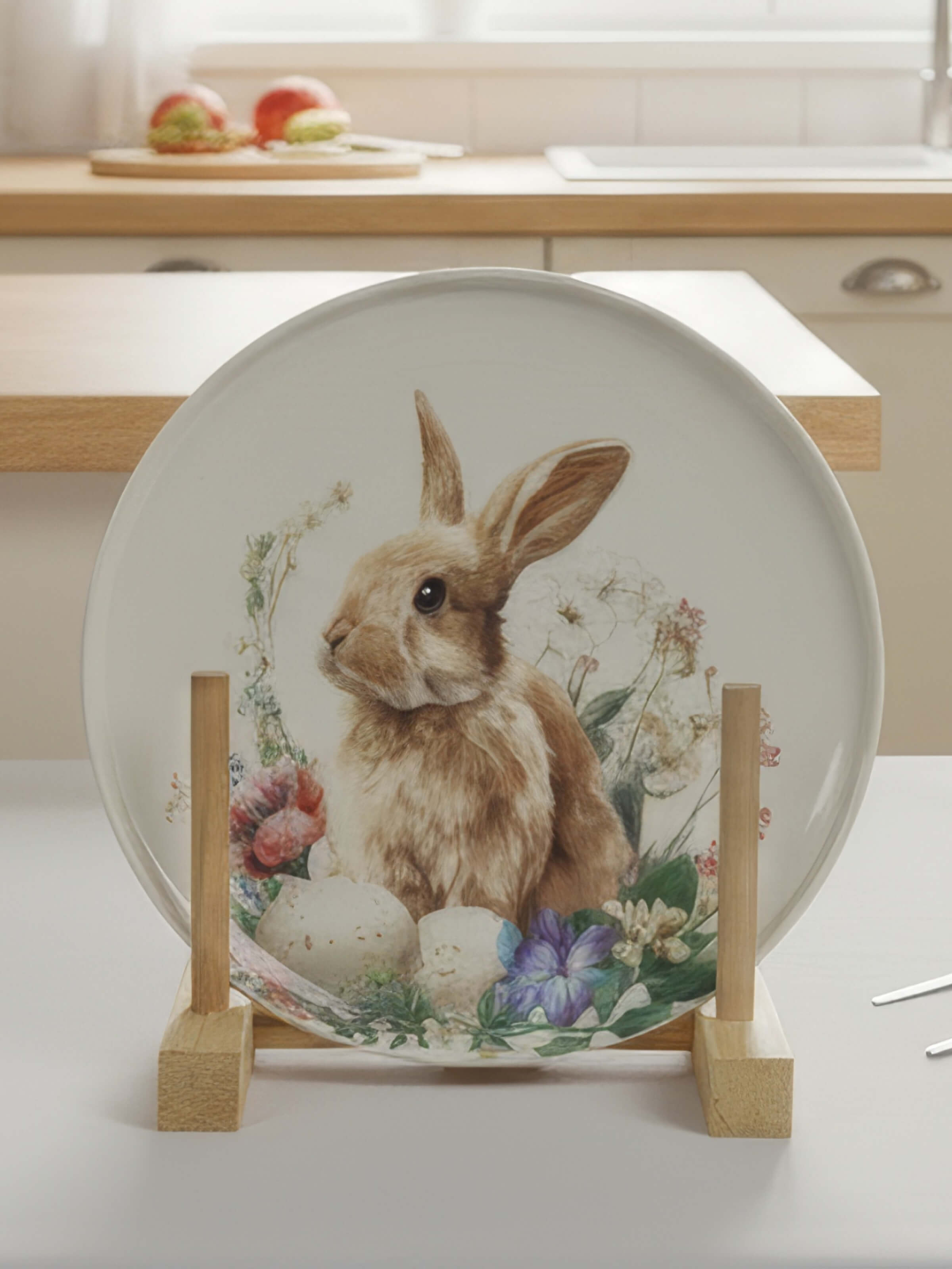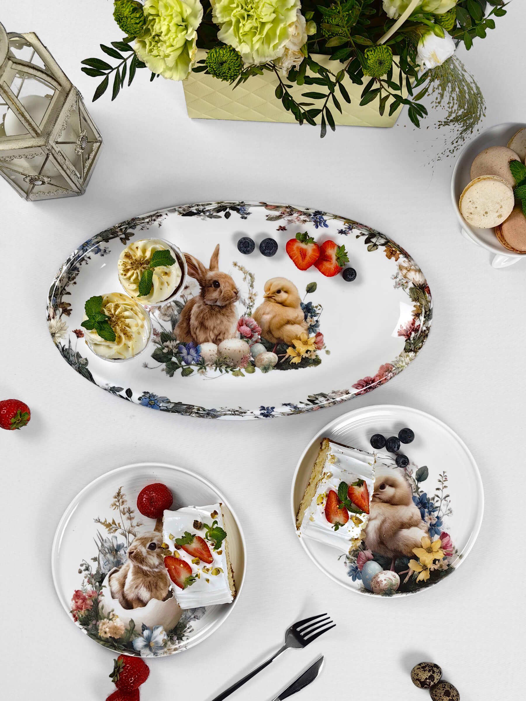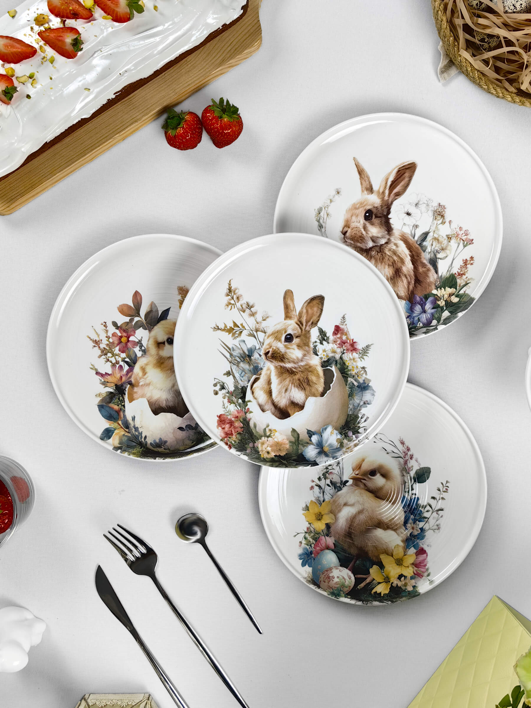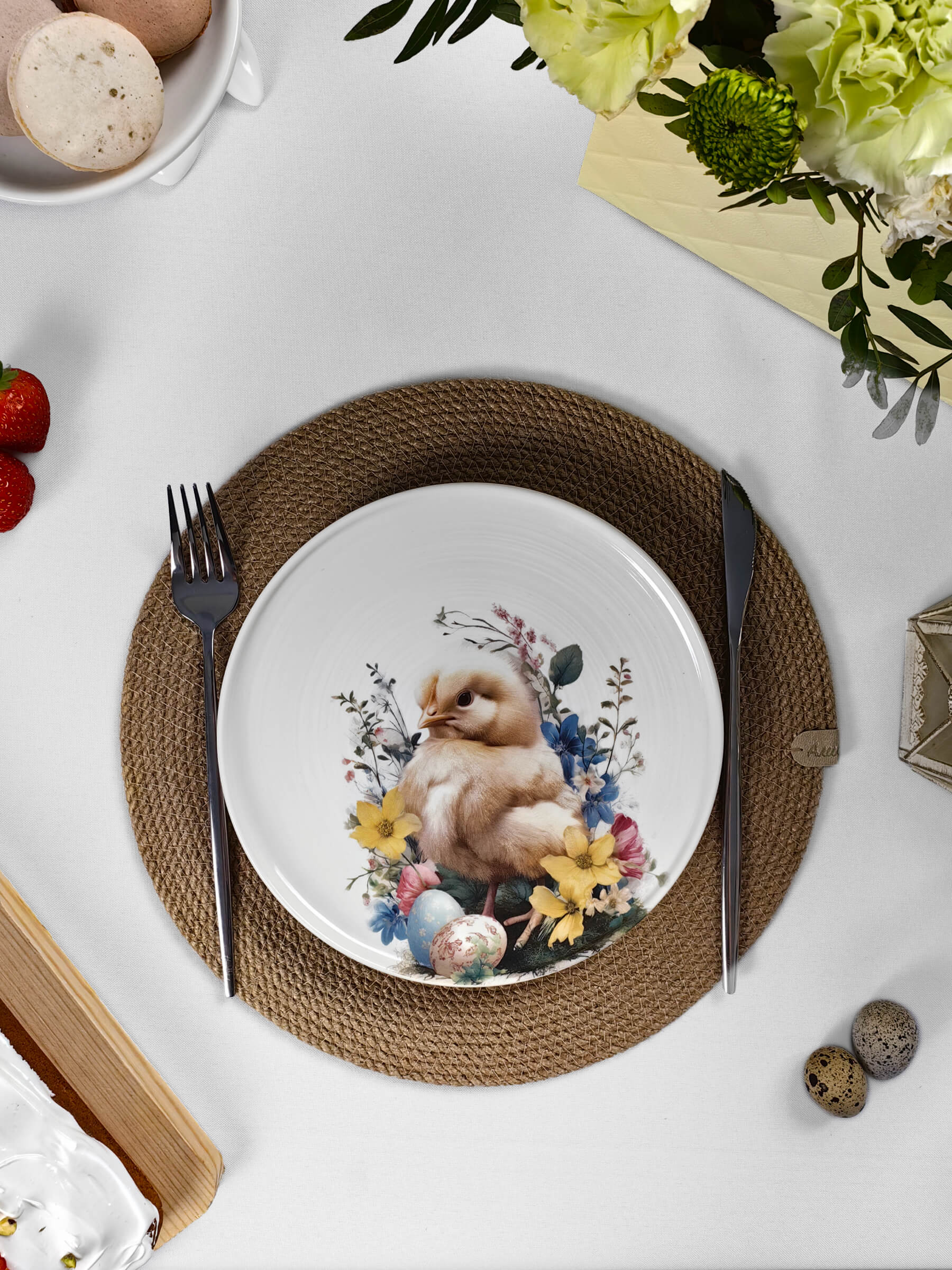 Белый фарфор с тёплым матовым блеском становится холстом для этой светлой истории. Глубокий бортик тарелок обрамляет сюжет, как оконная рама — вид на самый радостный день весны. Авторские рисунки созданы с любовью к деталям: каждый пушок на цыплёнке, каждый усик крольчонка, каждый лепесток и капелька росы на крашеном яйце.
