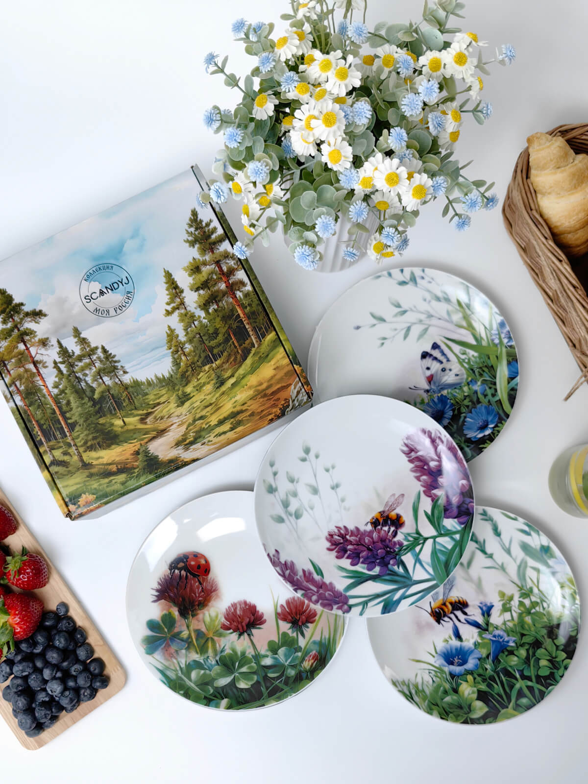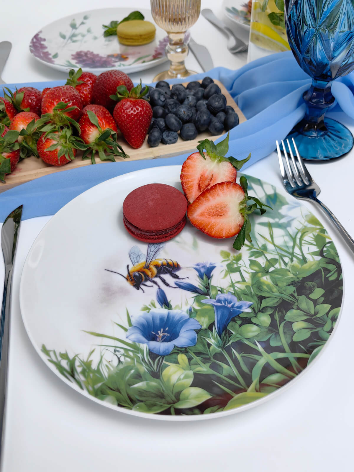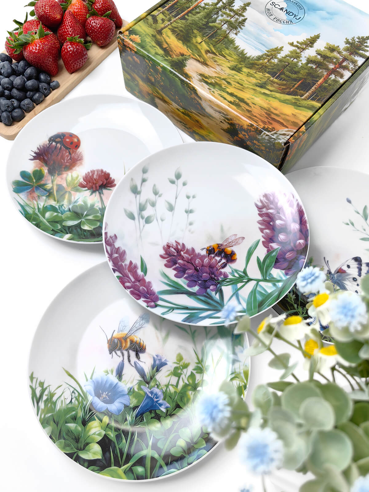 Набор выполнен из фарфора — легкого, искристого, с благородным блеском, который подчеркивает фотографическую точность каждой детали. Диаметр 20,5 см идеален для сервировки ягод, изысканных десертов или легких закусок, превращая обычный прием пищи в прогулку по цветущему лугу.