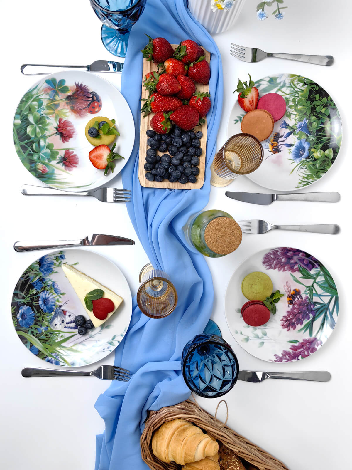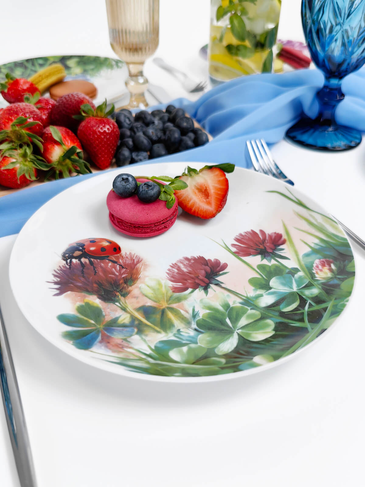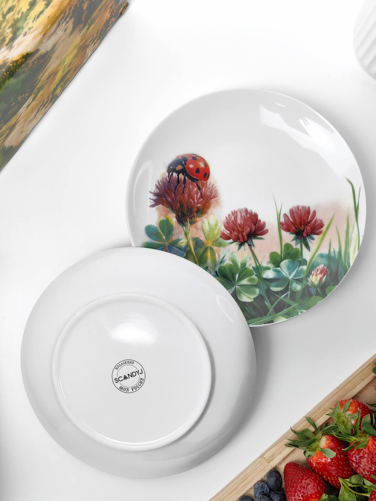 Набор выполнен из фарфора — легкого, искристого, с благородным блеском, который подчеркивает фотографическую точность каждой детали. Диаметр 20,5 см идеален для сервировки ягод, изысканных десертов или легких закусок, превращая обычный прием пищи в прогулку по цветущему лугу.
