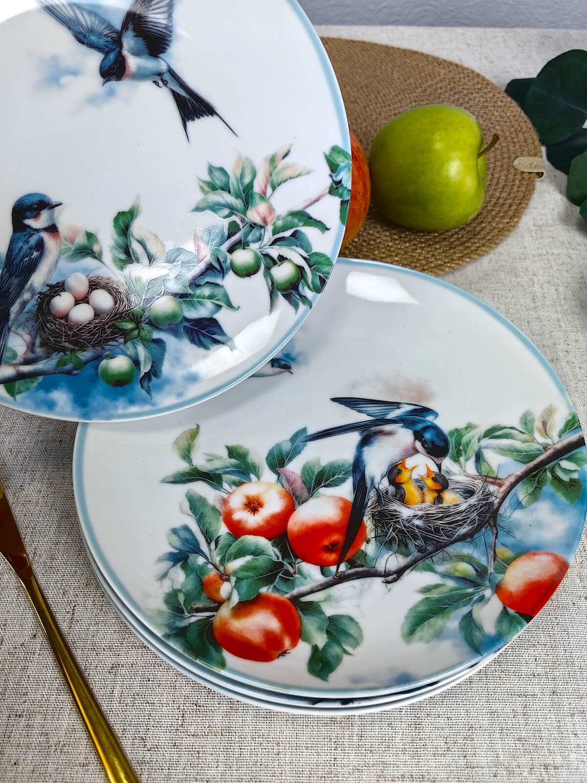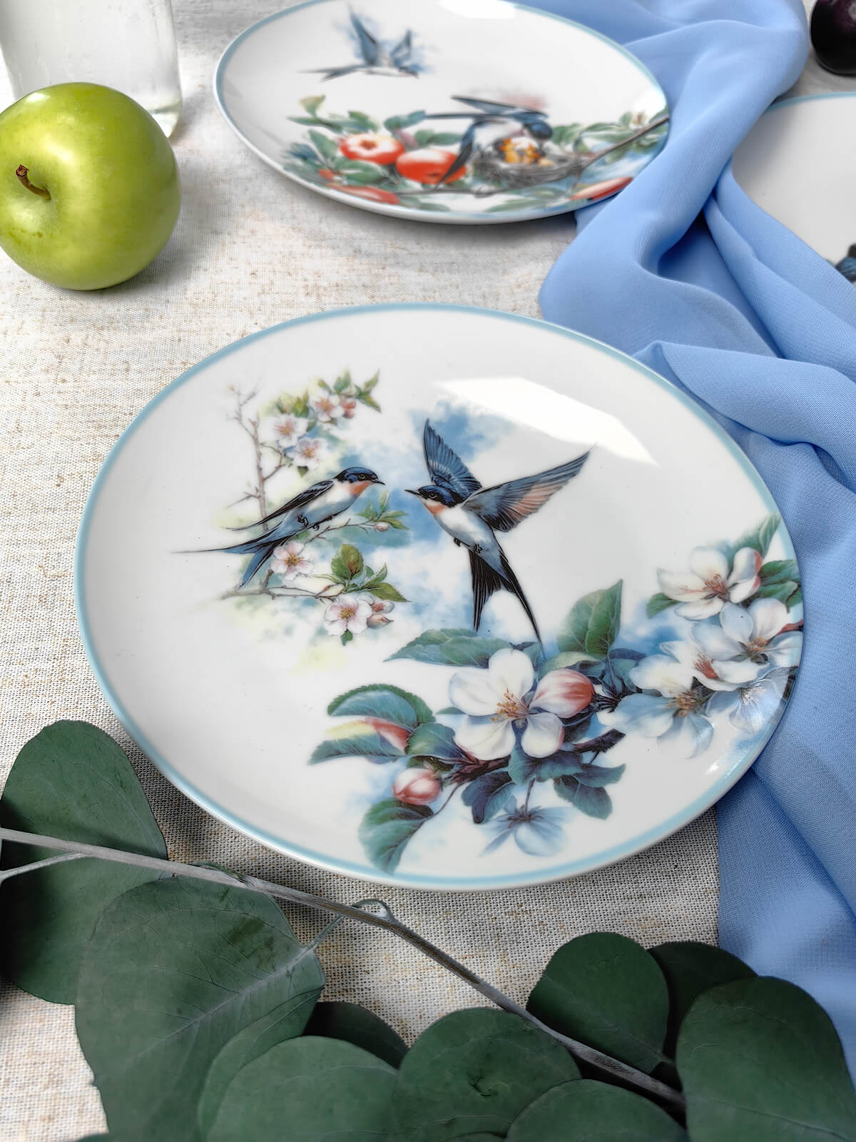 Тарелки из благородного фарфора (диаметр 20,5 см) с перламутровым сиянием. Ювелирные детали: — нежность нераскрытых бутонов, — позолота на кончиках крыльев, — бархатная глубина спелых яблок.
