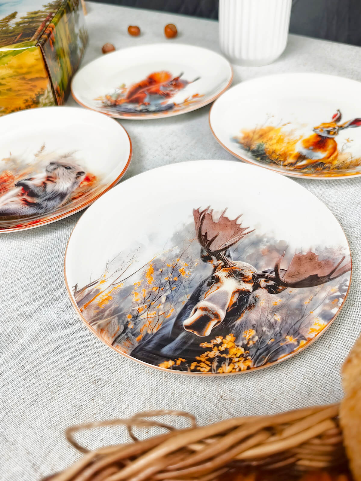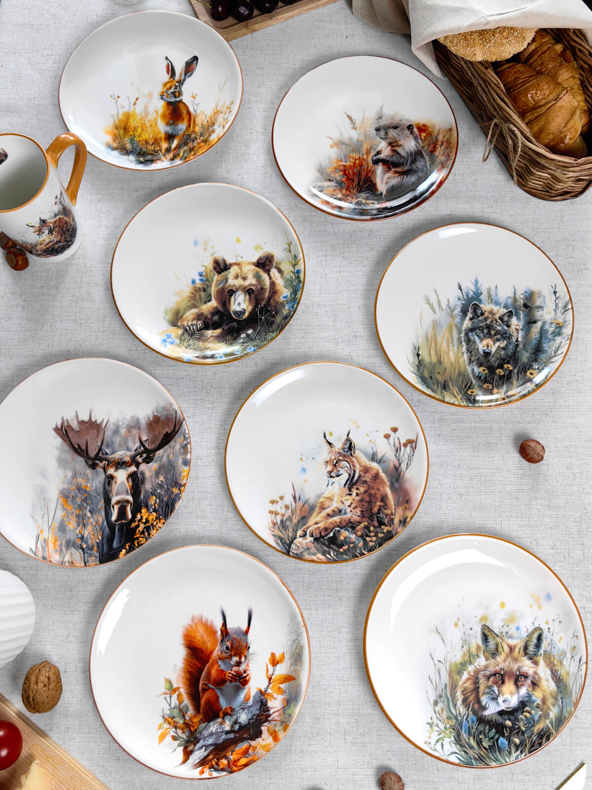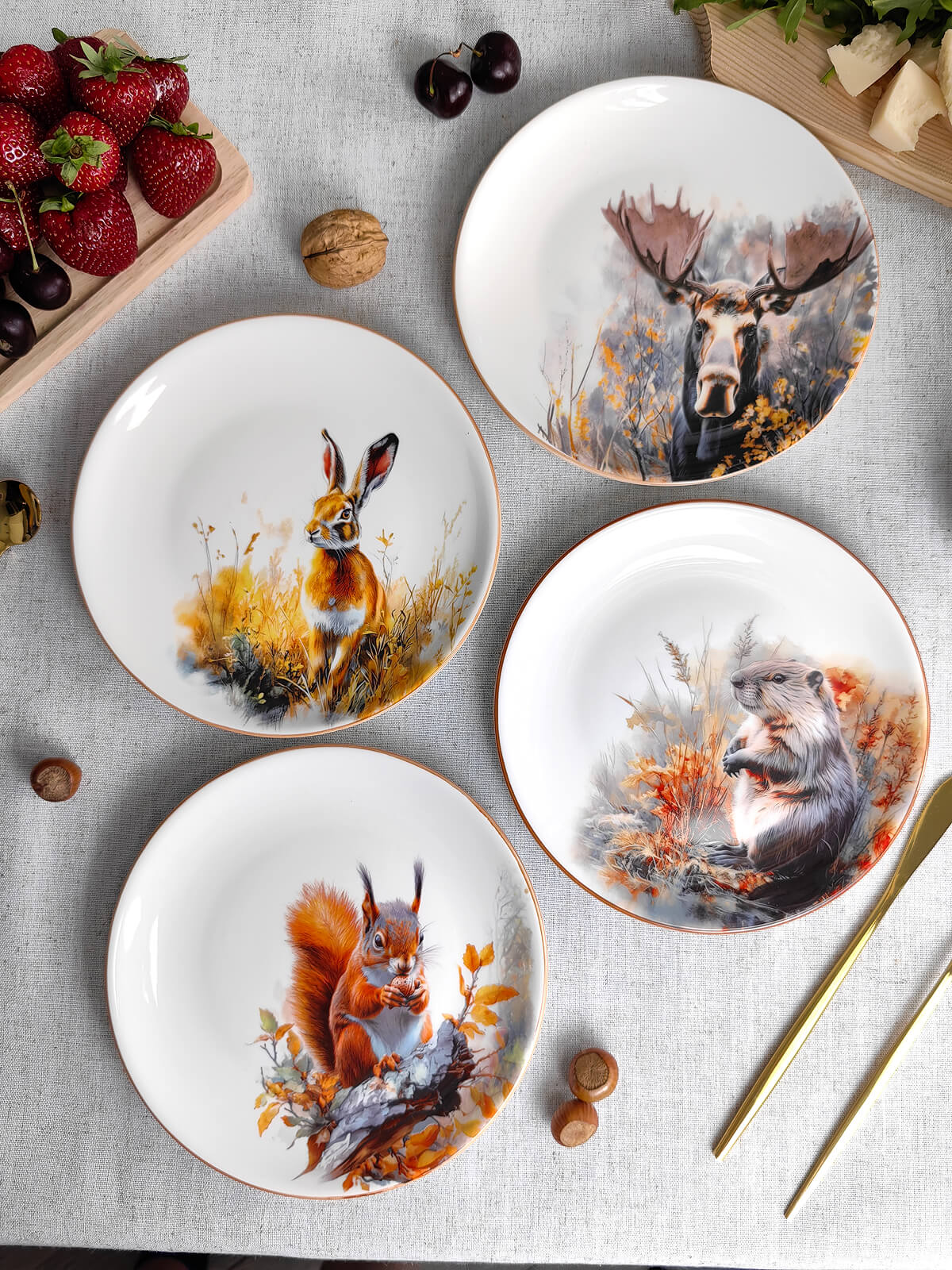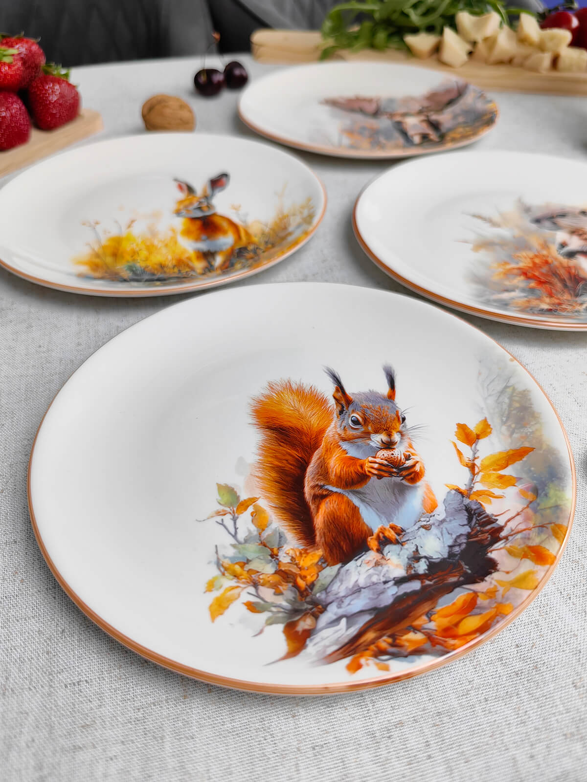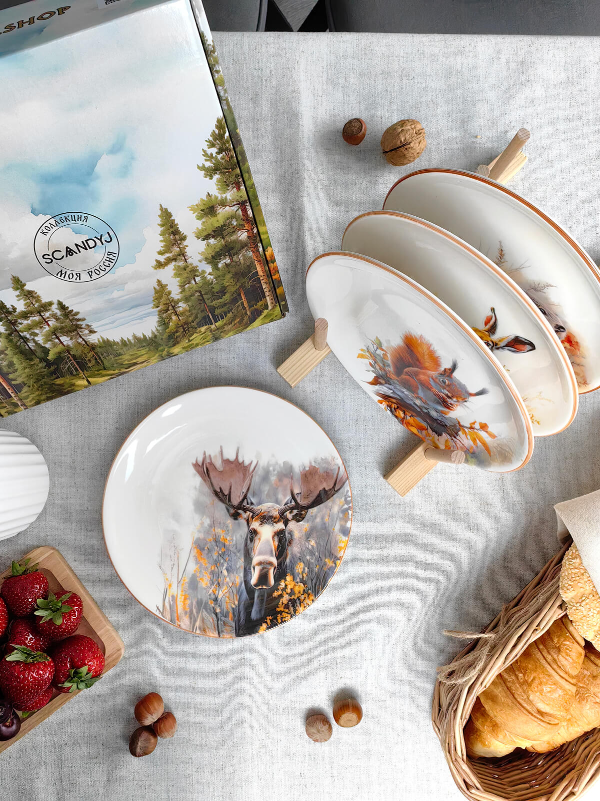 Почувствуйте гармонию заповедного леса и нежность русской природы — на каждой тарелке этой коллекции оживает сказка из детства. Четыре хранителя лесного царства: — Белка с огненным хвостом в сосновых ветвях, будто золотой орех вот-вот сорвется с фарфора, — Заяц — пушистый облачко среди травы, застывший в прыжке над утренней росой, — Бобёр у зеркальной запруды, где каждая щепка в лапках светится янтарной смолой, — Лось с ветвистой короной рогов в тумане, величавый как дуб-исполин.