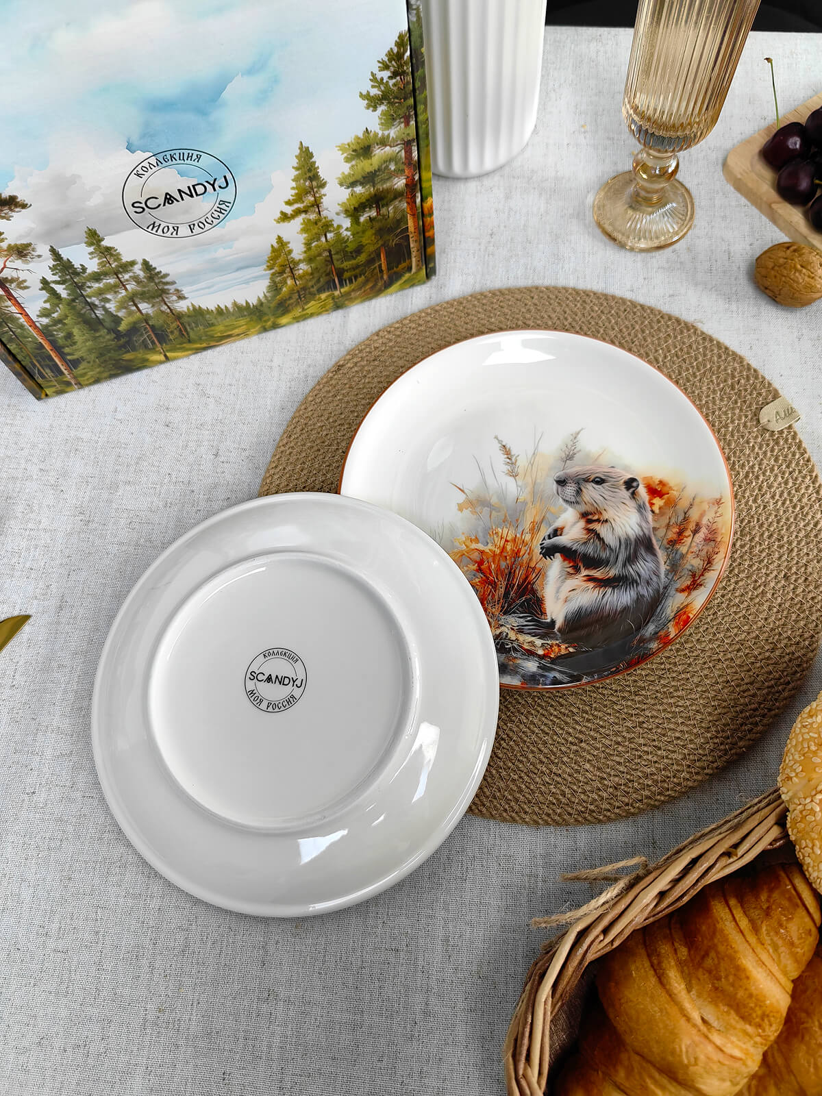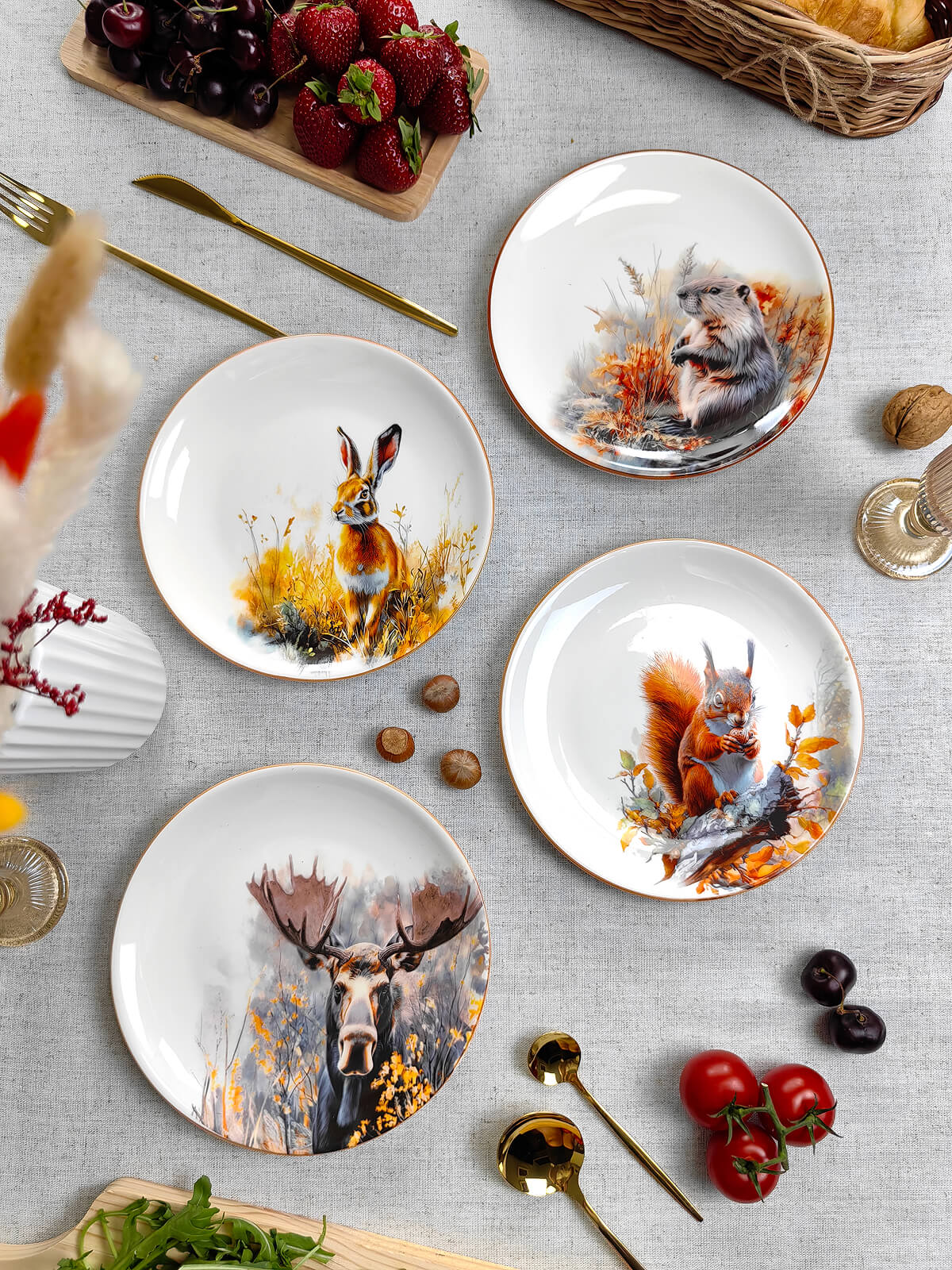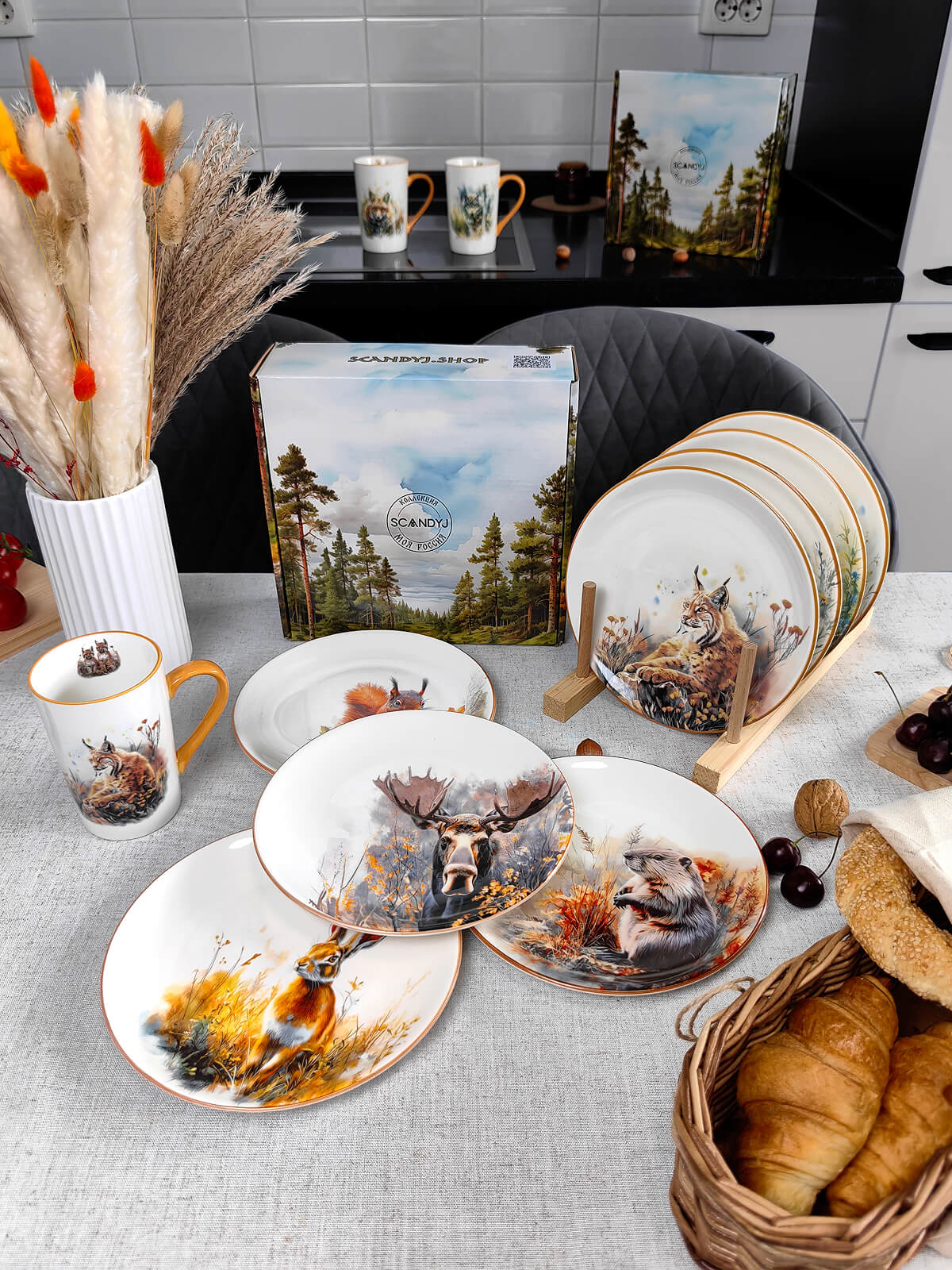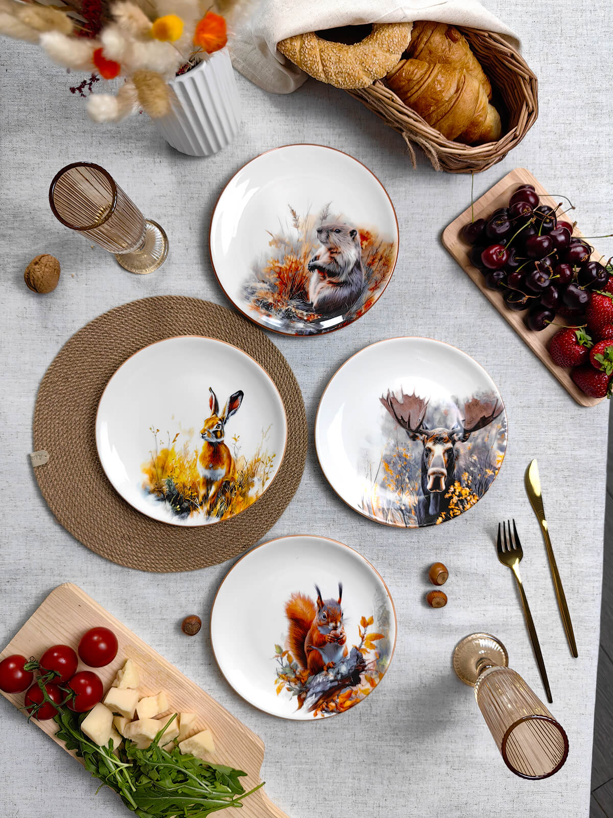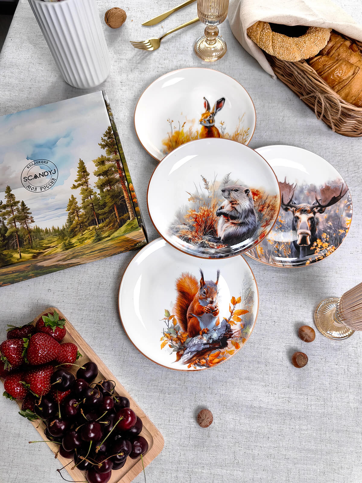 Почувствуйте гармонию заповедного леса и нежность русской природы — на каждой тарелке этой коллекции оживает сказка из детства. Четыре хранителя лесного царства: — Белка с огненным хвостом в сосновых ветвях, будто золотой орех вот-вот сорвется с фарфора, — Заяц — пушистый облачко среди травы, застывший в прыжке над утренней росой, — Бобёр у зеркальной запруды, где каждая щепка в лапках светится янтарной смолой, — Лось с ветвистой короной рогов в тумане, величавый как дуб-исполин.