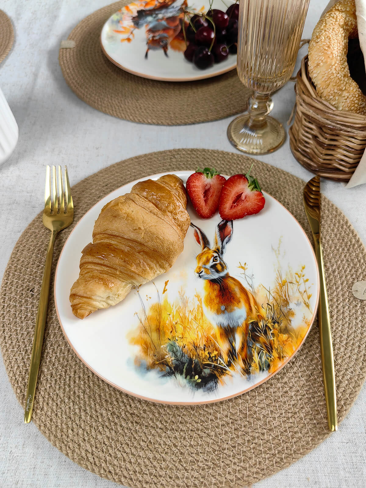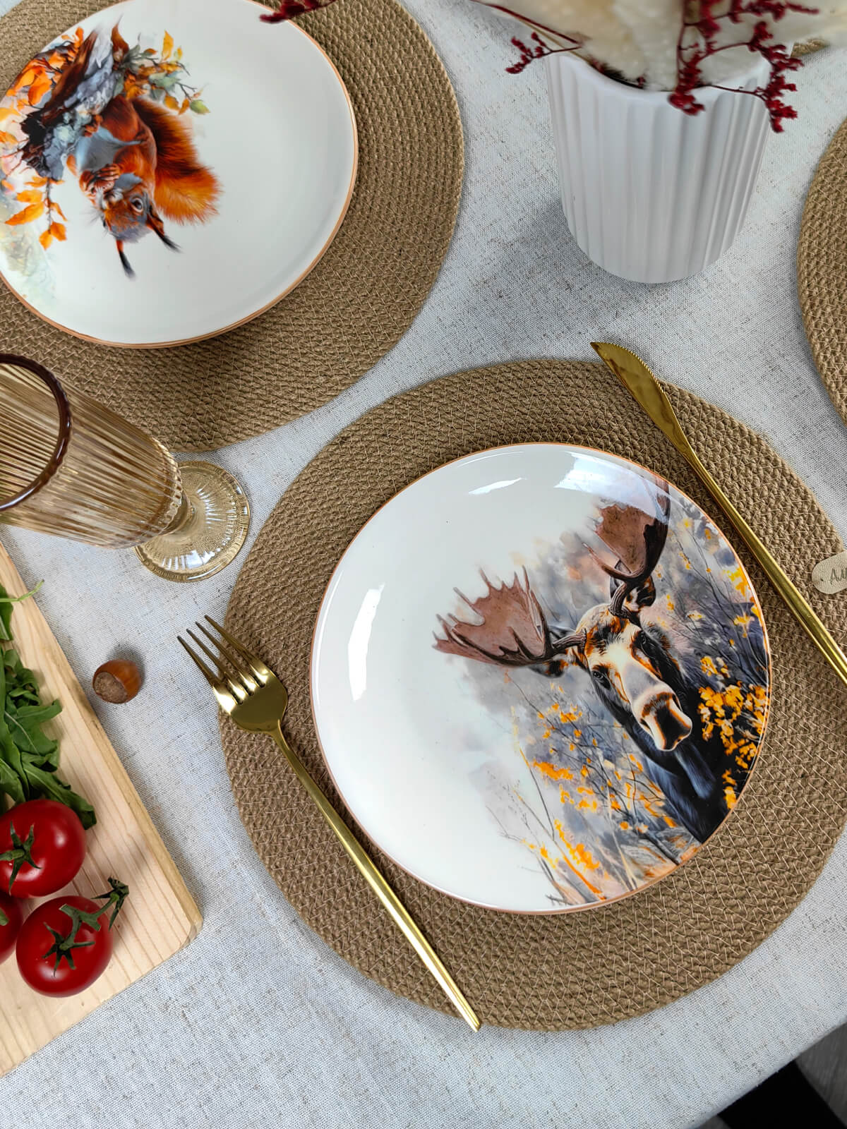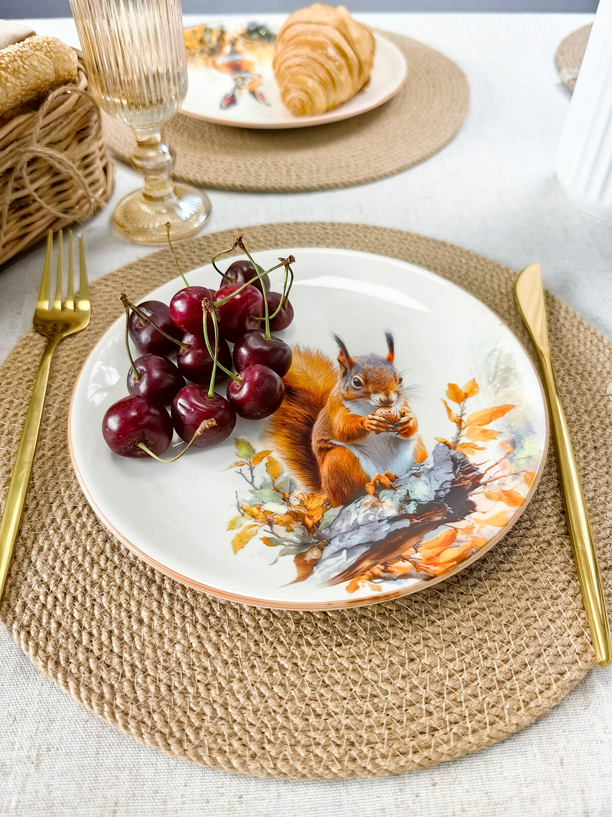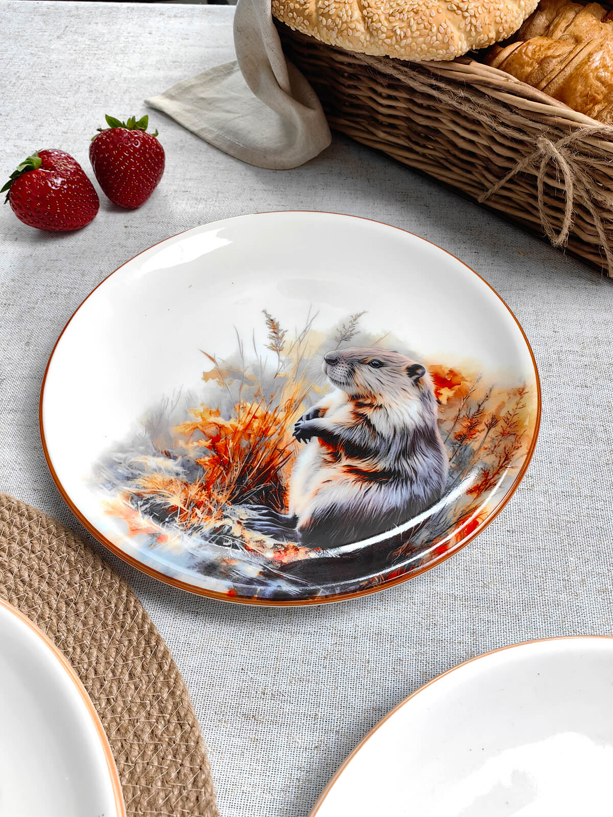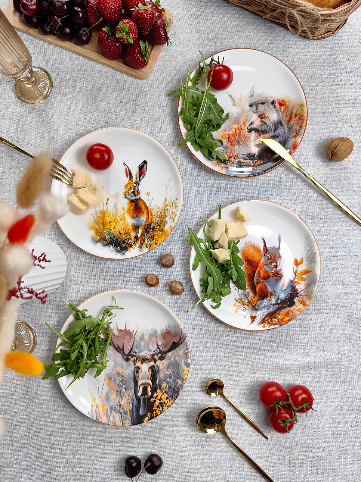 Почувствуйте гармонию заповедного леса и нежность русской природы — на каждой тарелке этой коллекции оживает сказка из детства. Четыре хранителя лесного царства: — Белка с огненным хвостом в сосновых ветвях, будто золотой орех вот-вот сорвется с фарфора, — Заяц — пушистый облачко среди травы, застывший в прыжке над утренней росой, — Бобёр у зеркальной запруды, где каждая щепка в лапках светится янтарной смолой, — Лось с ветвистой короной рогов в тумане, величавый как дуб-исполин.