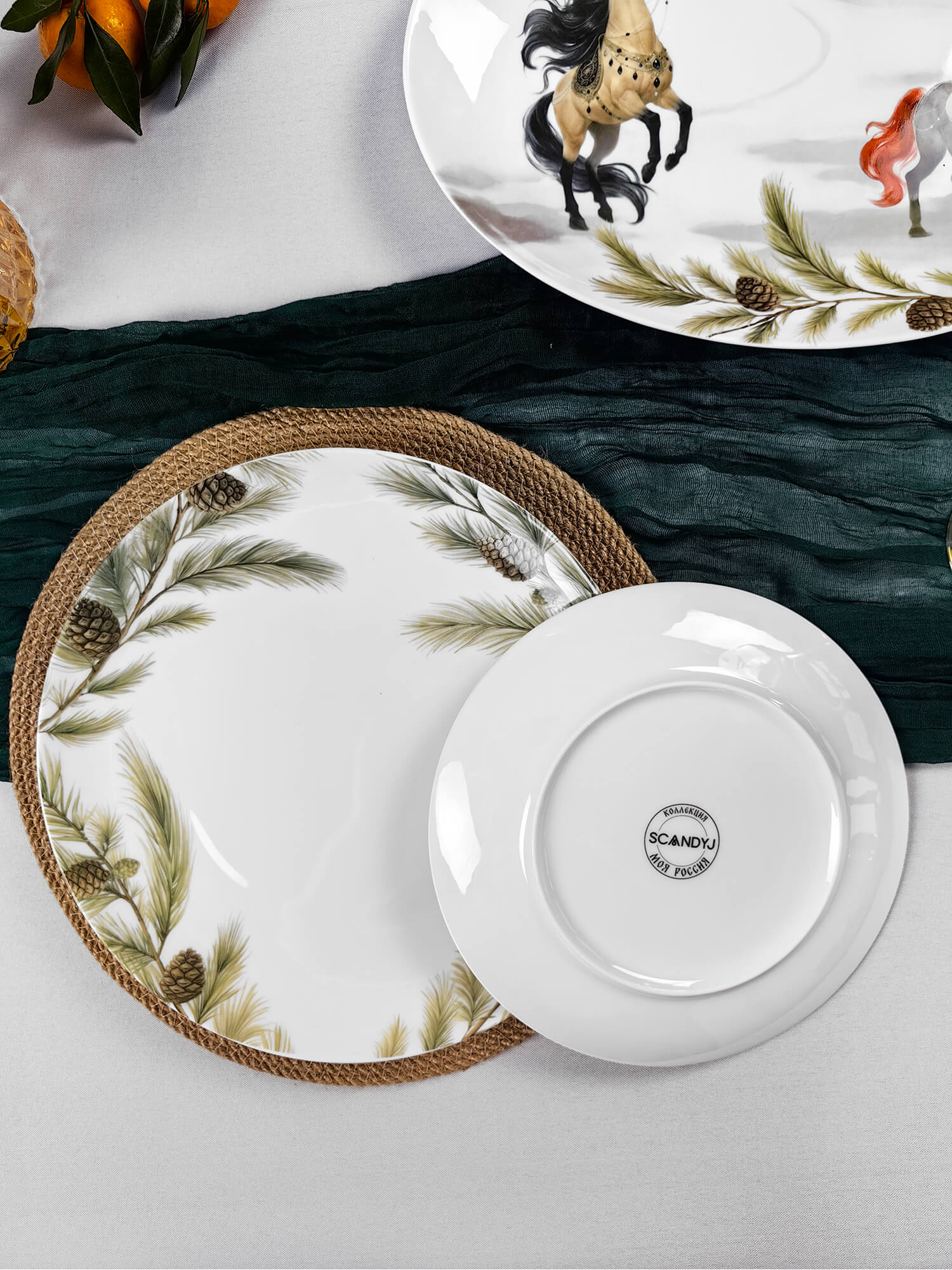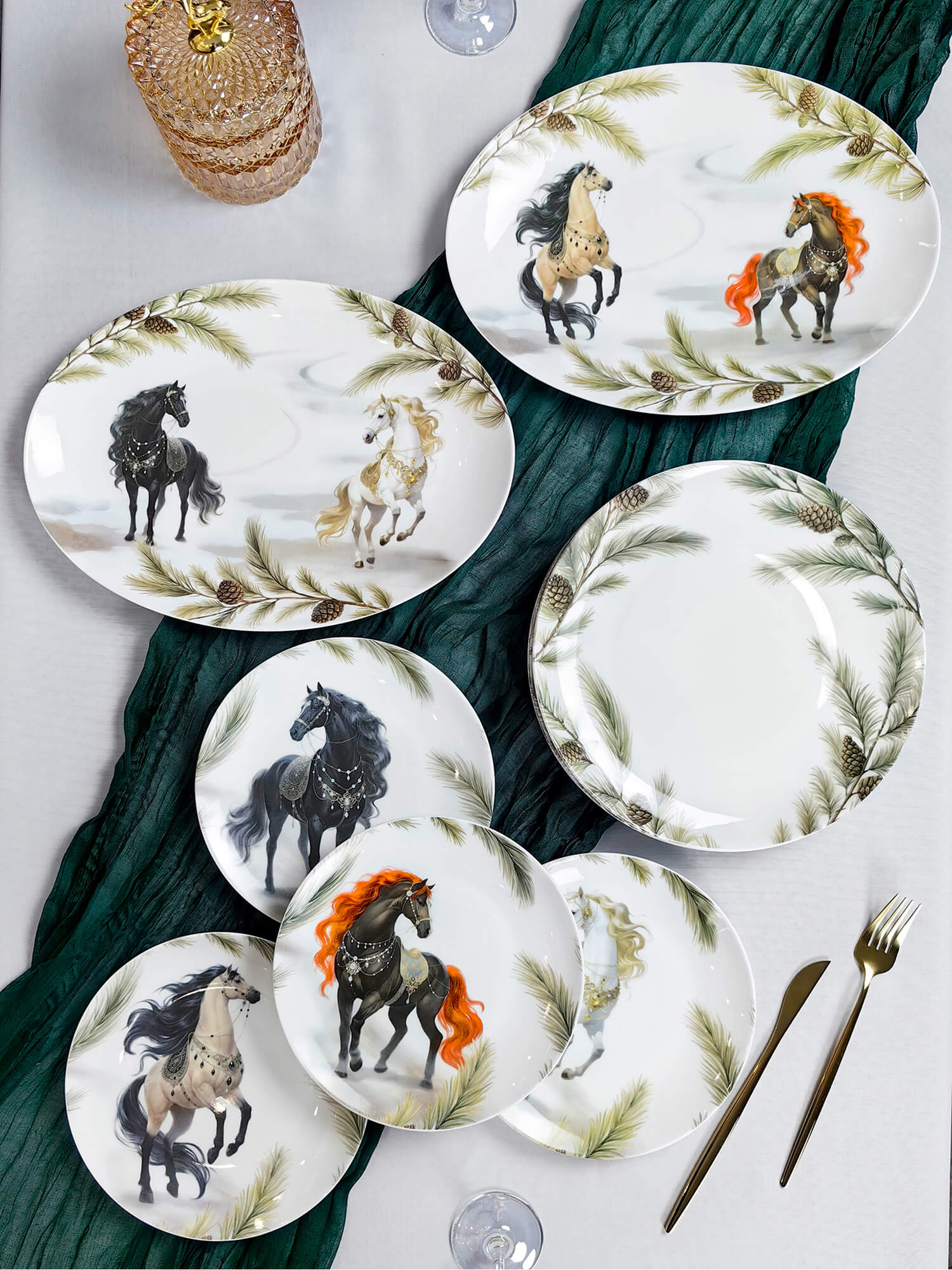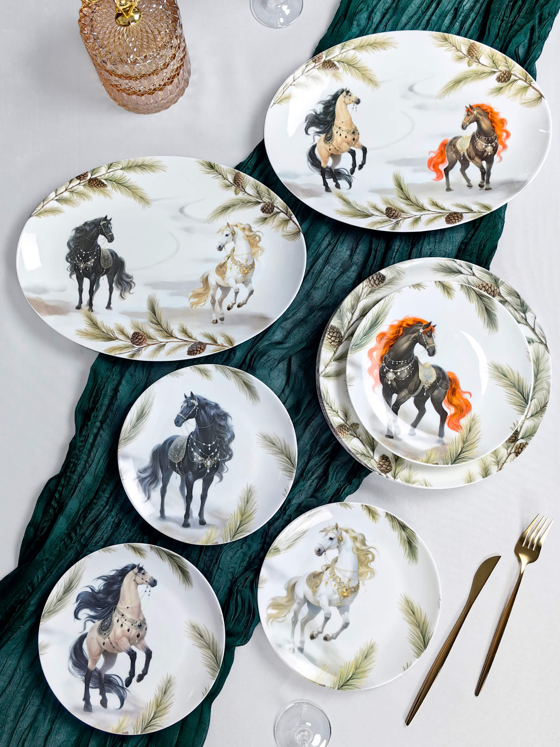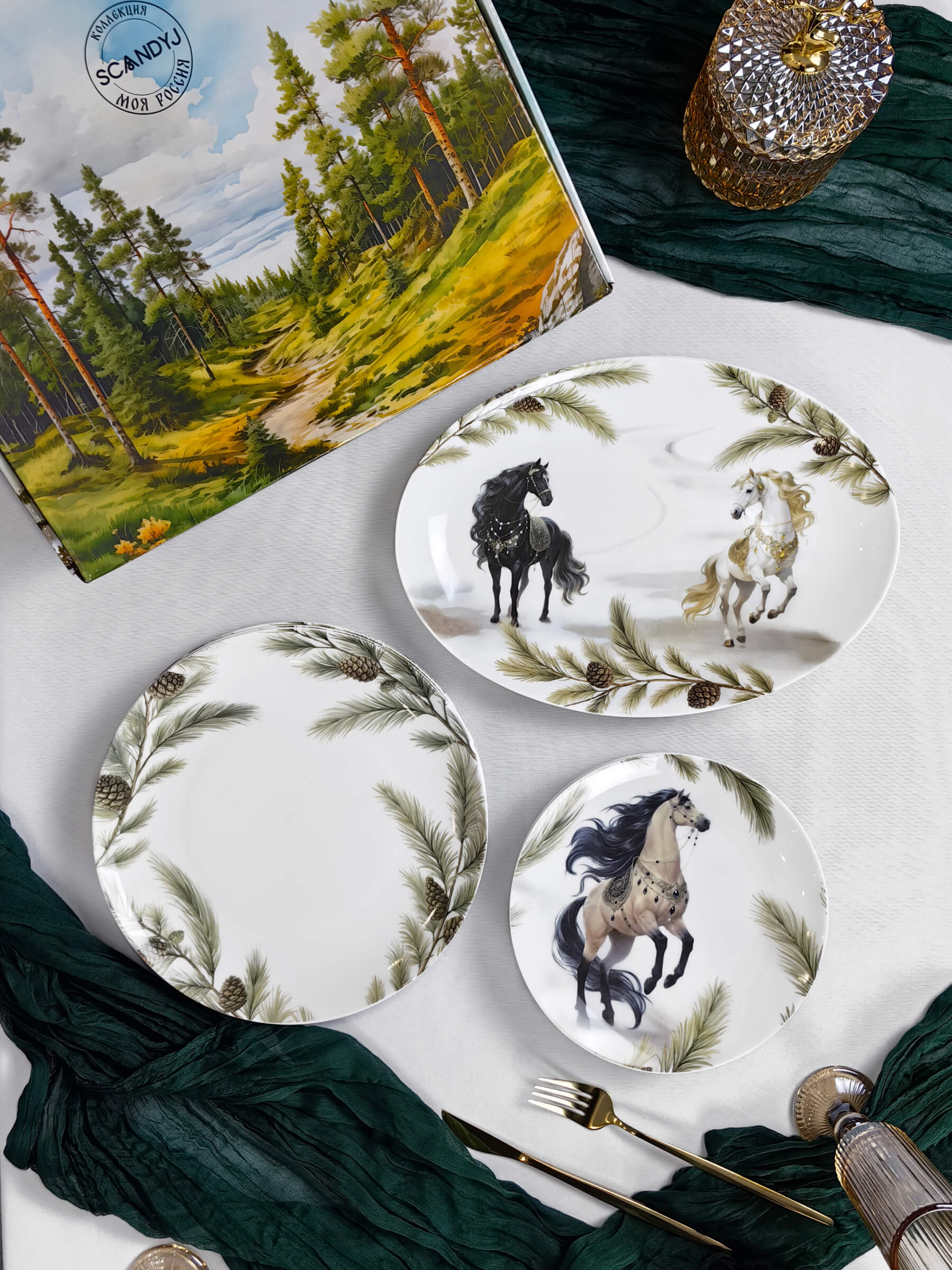· 4 большие тарелки (диаметр 27 см): Их край обрамлён кружевом из тончайших еловых веточек с янтарными шишками. Это лесная оправа, в которой живёт главное чудо. · 4 верхние тарелки (диаметр 20,5 см): На них — четверка роскошных коней, выбежавших из сказки. У каждого — свой нрав, своя история в развевающейся гриве и могучем изгибе шеи. Их упряжка не просто сияет — она усыпана камнями цвета зимнего неба, ночного льда и пламени камина. Эти тарелки кладутся поверх больших, создавая волшебную глубину и рассказывая свою легенду для каждого гостя. · 2 сервировочных блюда: Пространство для щедрости праздника. На них раскинулись целые еловые лапы и по паре скакунов, перескочивших с малых тарелок на сервировочные блюда, чтобы и здесь вас радовать своей красотой. Сюда можно положить всё, чем славится русское застолье — от узорчатых пряников до томлёного гуся с яблоками.