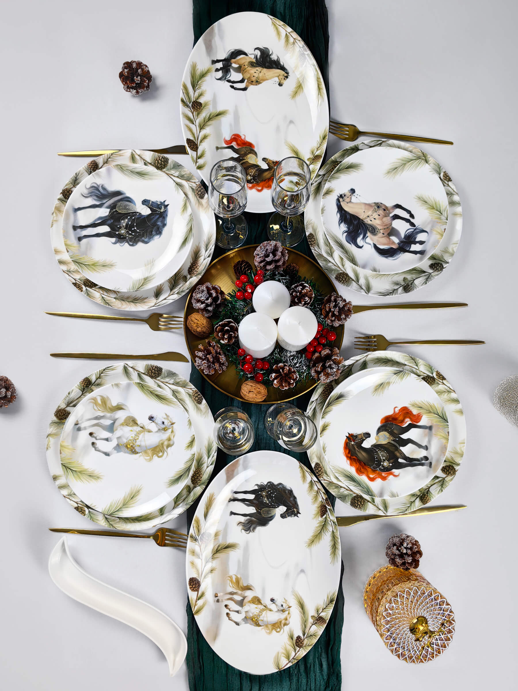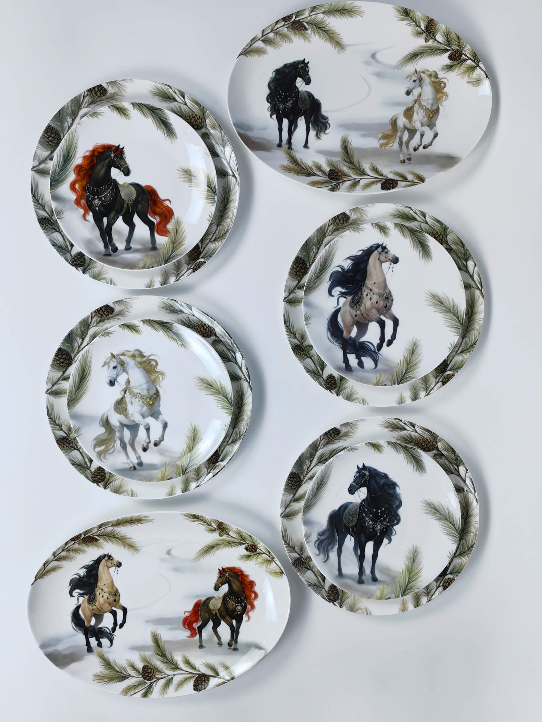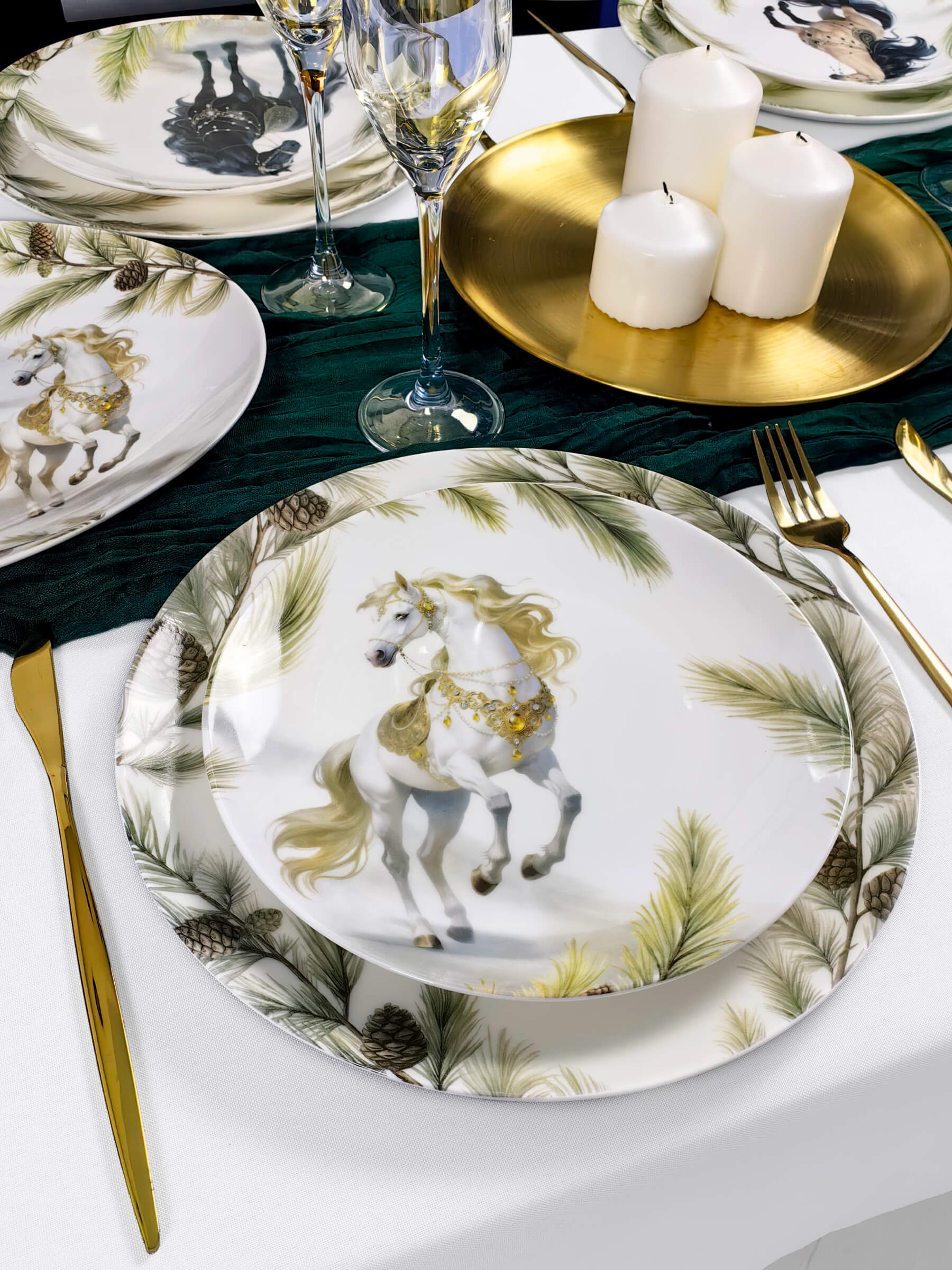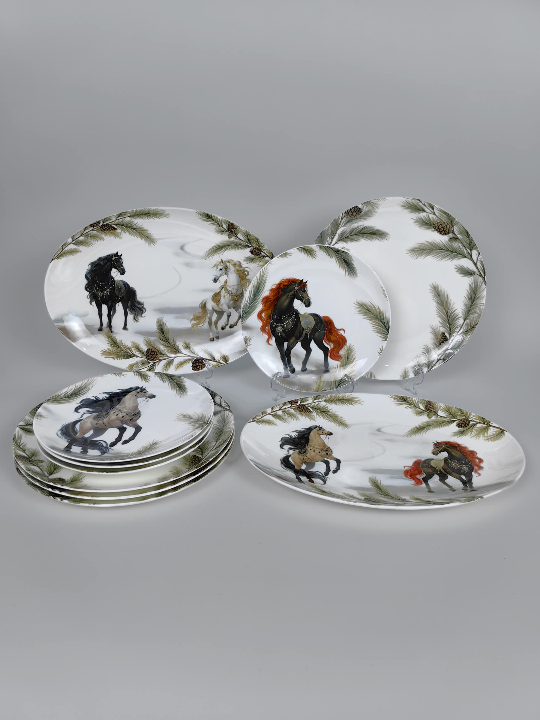 · 4 большие тарелки (диаметр 27 см): Их край обрамлён кружевом из тончайших еловых веточек с янтарными шишками. Это лесная оправа, в которой живёт главное чудо. · 4 верхние тарелки (диаметр 20,5 см): На них — четверка роскошных коней, выбежавших из сказки. У каждого — свой нрав, своя история в развевающейся гриве и могучем изгибе шеи. Их упряжка не просто сияет — она усыпана камнями цвета зимнего неба, ночного льда и пламени камина. Эти тарелки кладутся поверх больших, создавая волшебную глубину и рассказывая свою легенду для каждого гостя. · 2 сервировочных блюда: Пространство для щедрости праздника. На них раскинулись целые еловые лапы и по паре скакунов, перескочивших с малых тарелок на сервировочные блюда, чтобы и здесь вас радовать своей красотой. Сюда можно положить всё, чем славится русское застолье — от узорчатых пряников до томлёного гуся с яблоками.