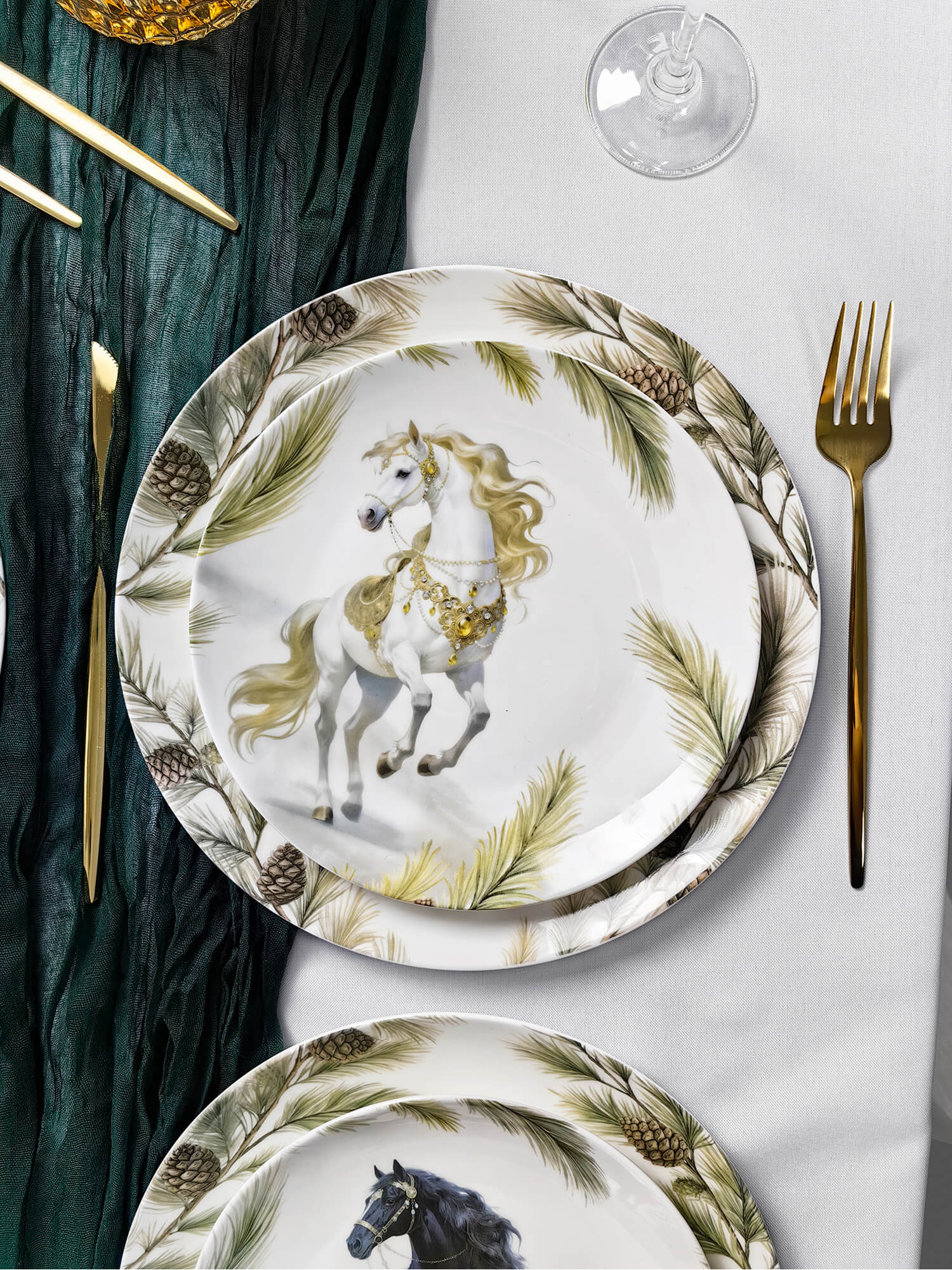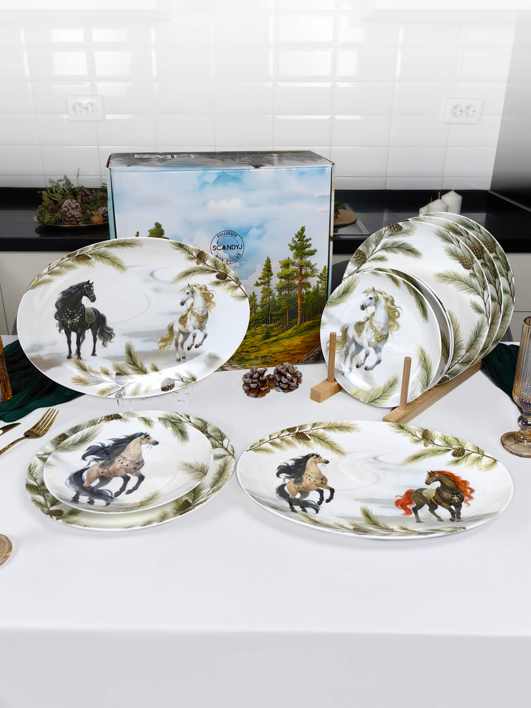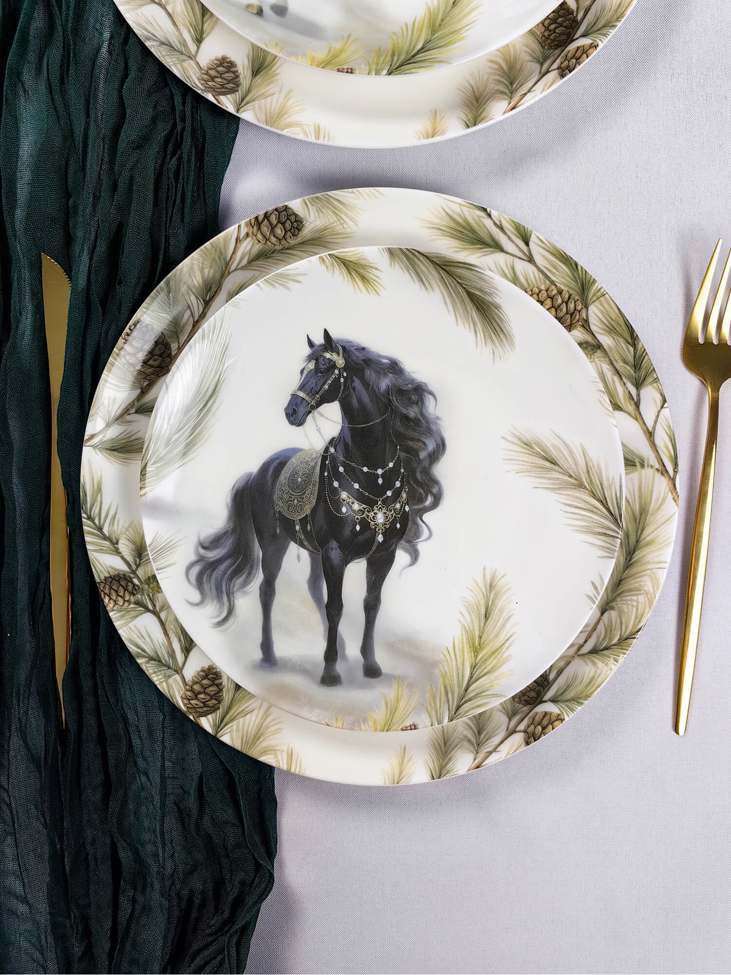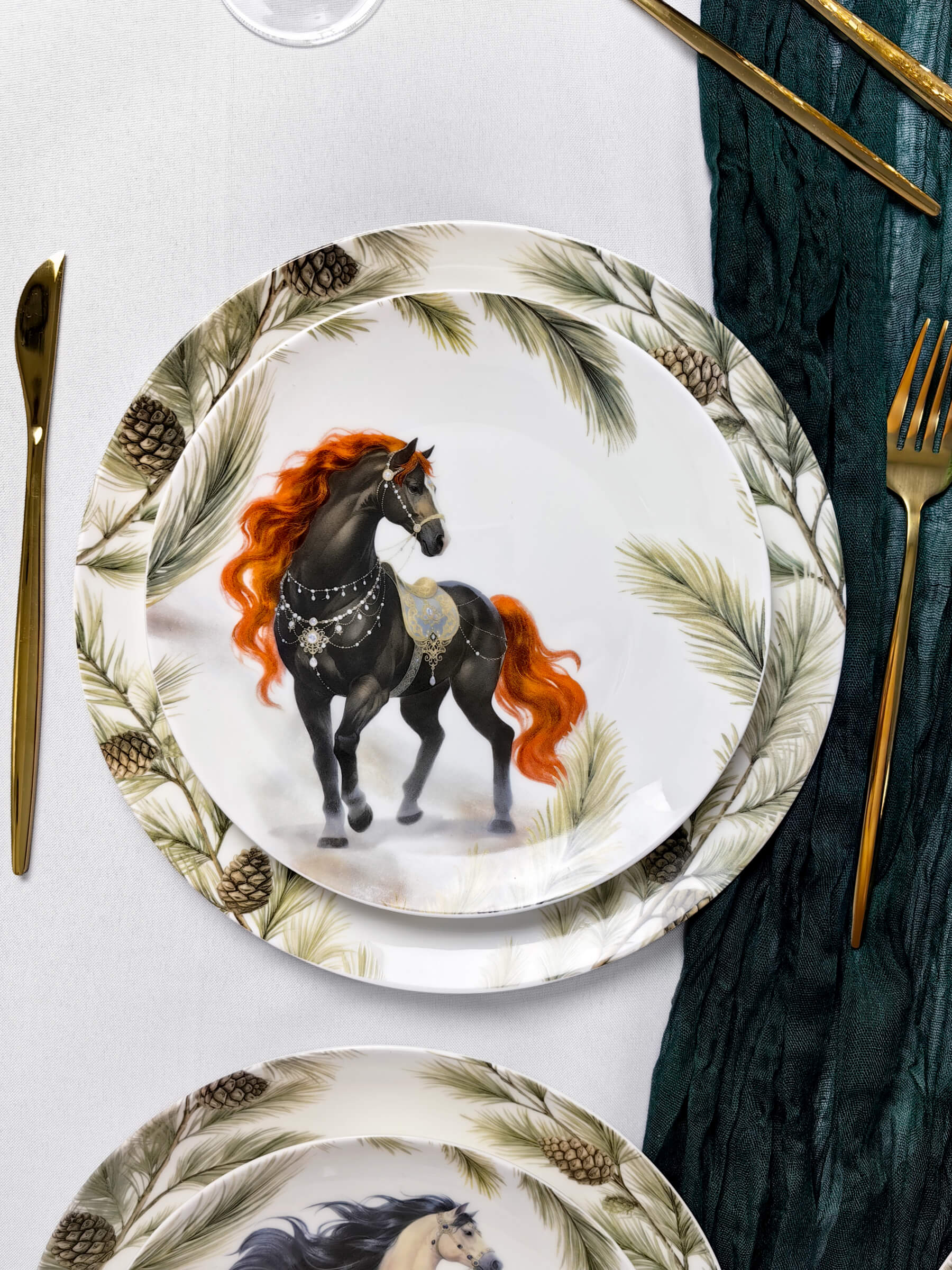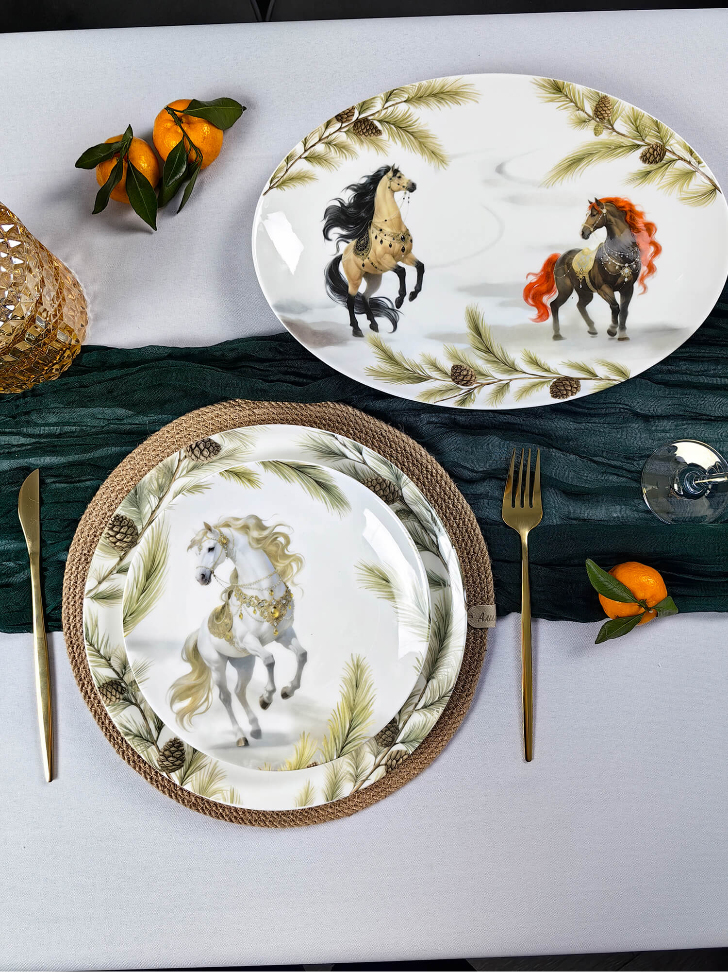· 4 большие тарелки (диаметр 27 см): Их край обрамлён кружевом из тончайших еловых веточек с янтарными шишками. Это лесная оправа, в которой живёт главное чудо. · 4 верхние тарелки (диаметр 20,5 см): На них — четверка роскошных коней, выбежавших из сказки. У каждого — свой нрав, своя история в развевающейся гриве и могучем изгибе шеи. Их упряжка не просто сияет — она усыпана камнями цвета зимнего неба, ночного льда и пламени камина. Эти тарелки кладутся поверх больших, создавая волшебную глубину и рассказывая свою легенду для каждого гостя. · 2 сервировочных блюда: Пространство для щедрости праздника. На них раскинулись целые еловые лапы и по паре скакунов, перескочивших с малых тарелок на сервировочные блюда, чтобы и здесь вас радовать своей красотой. Сюда можно положить всё, чем славится русское застолье — от узорчатых пряников до томлёного гуся с яблоками.