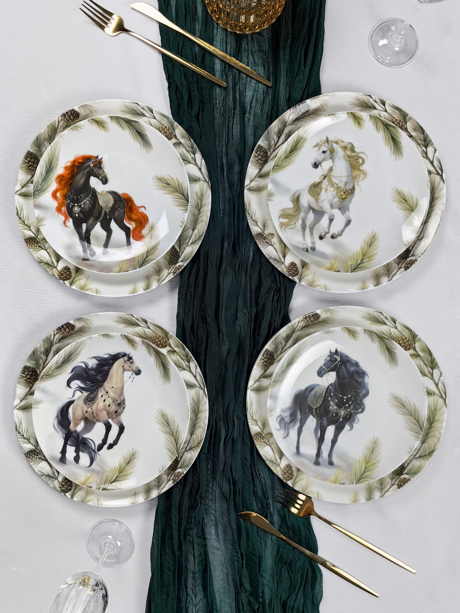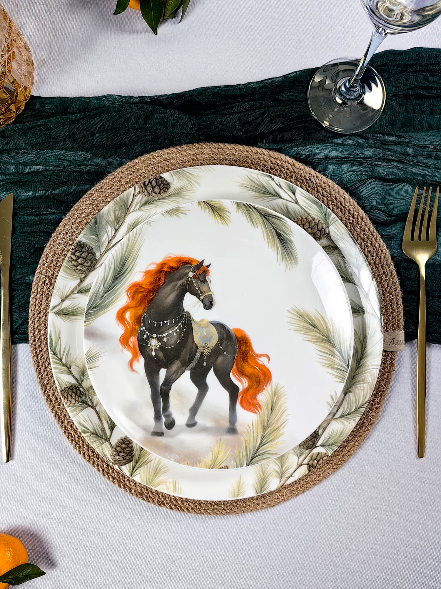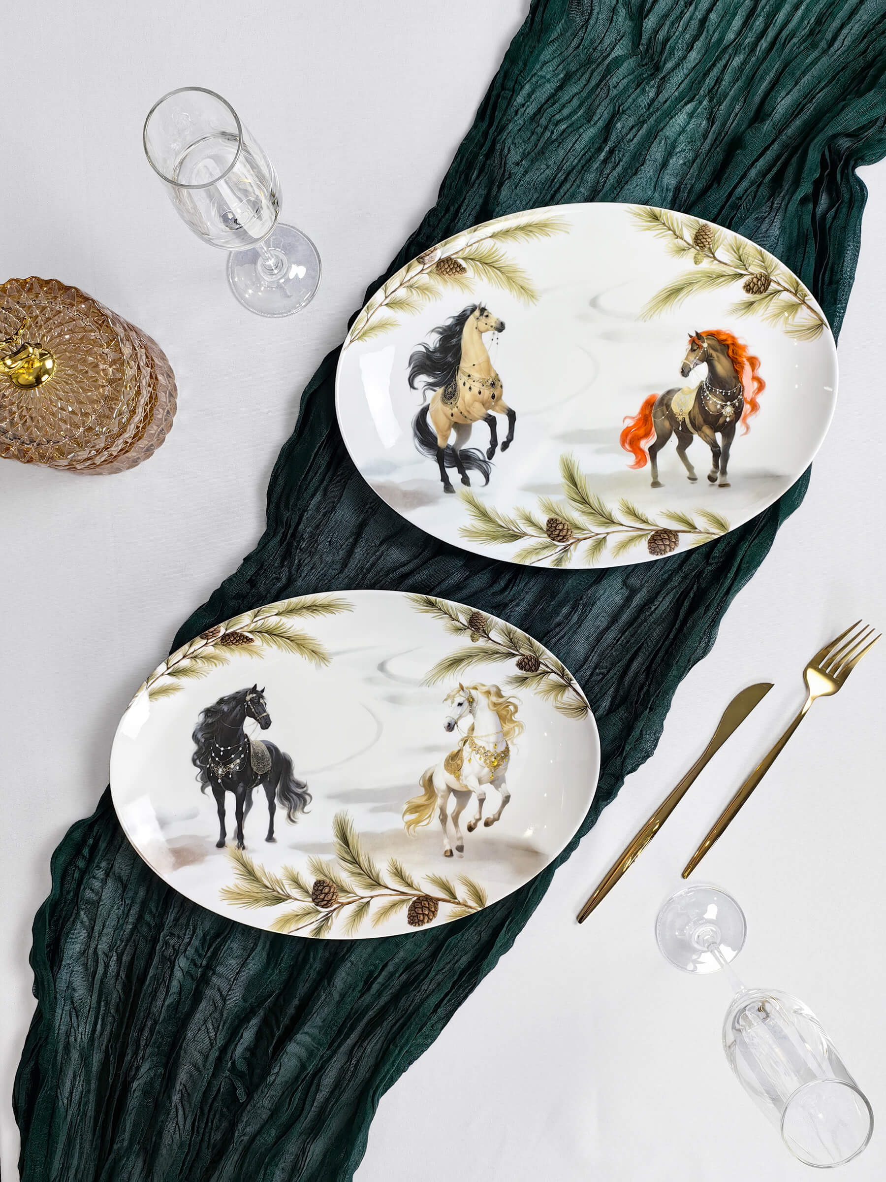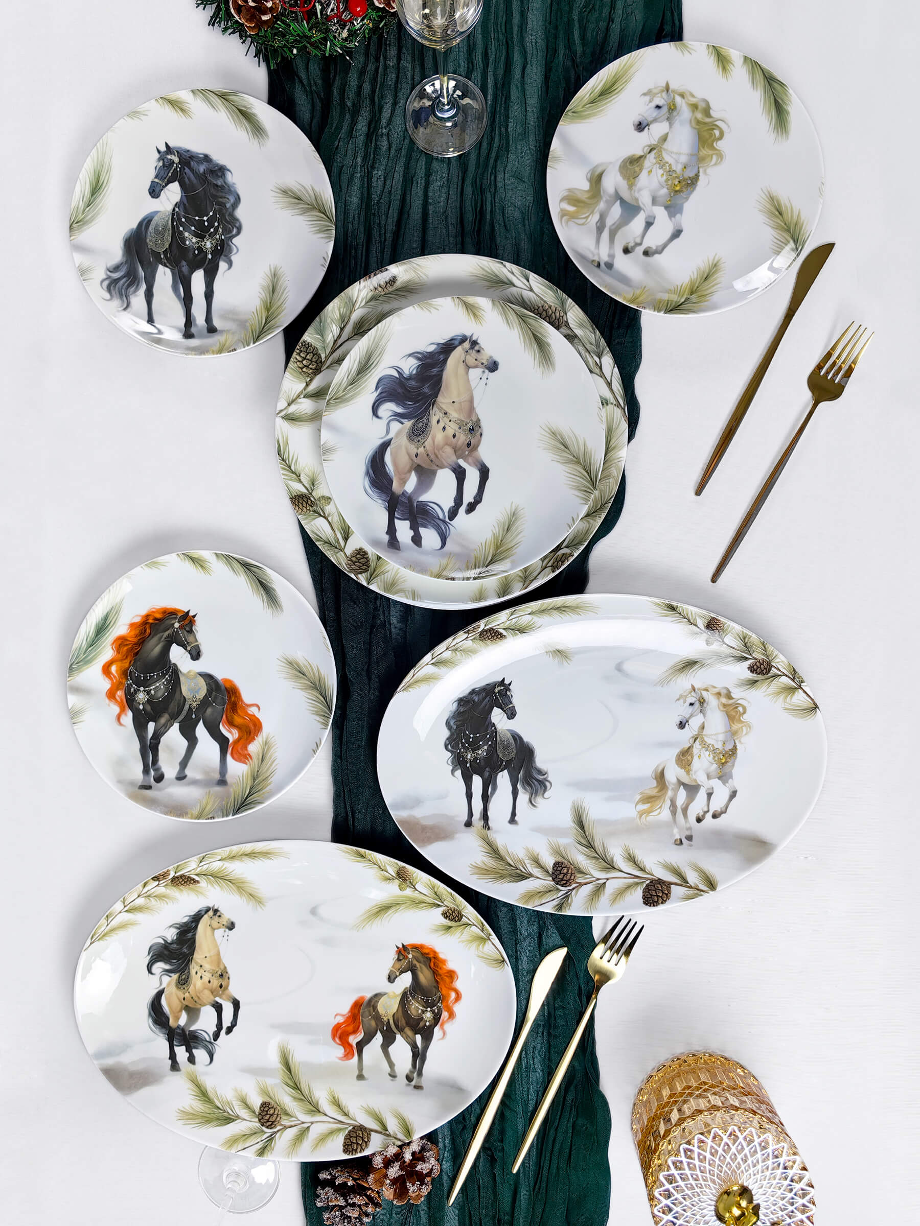 · 4 большие тарелки (диаметр 27 см): Их край обрамлён кружевом из тончайших еловых веточек с янтарными шишками. Это лесная оправа, в которой живёт главное чудо. · 4 верхние тарелки (диаметр 20,5 см): На них — четверка роскошных коней, выбежавших из сказки. У каждого — свой нрав, своя история в развевающейся гриве и могучем изгибе шеи. Их упряжка не просто сияет — она усыпана камнями цвета зимнего неба, ночного льда и пламени камина. Эти тарелки кладутся поверх больших, создавая волшебную глубину и рассказывая свою легенду для каждого гостя. · 2 сервировочных блюда: Пространство для щедрости праздника. На них раскинулись целые еловые лапы и по паре скакунов, перескочивших с малых тарелок на сервировочные блюда, чтобы и здесь вас радовать своей красотой. Сюда можно положить всё, чем славится русское застолье — от узорчатых пряников до томлёного гуся с яблоками.